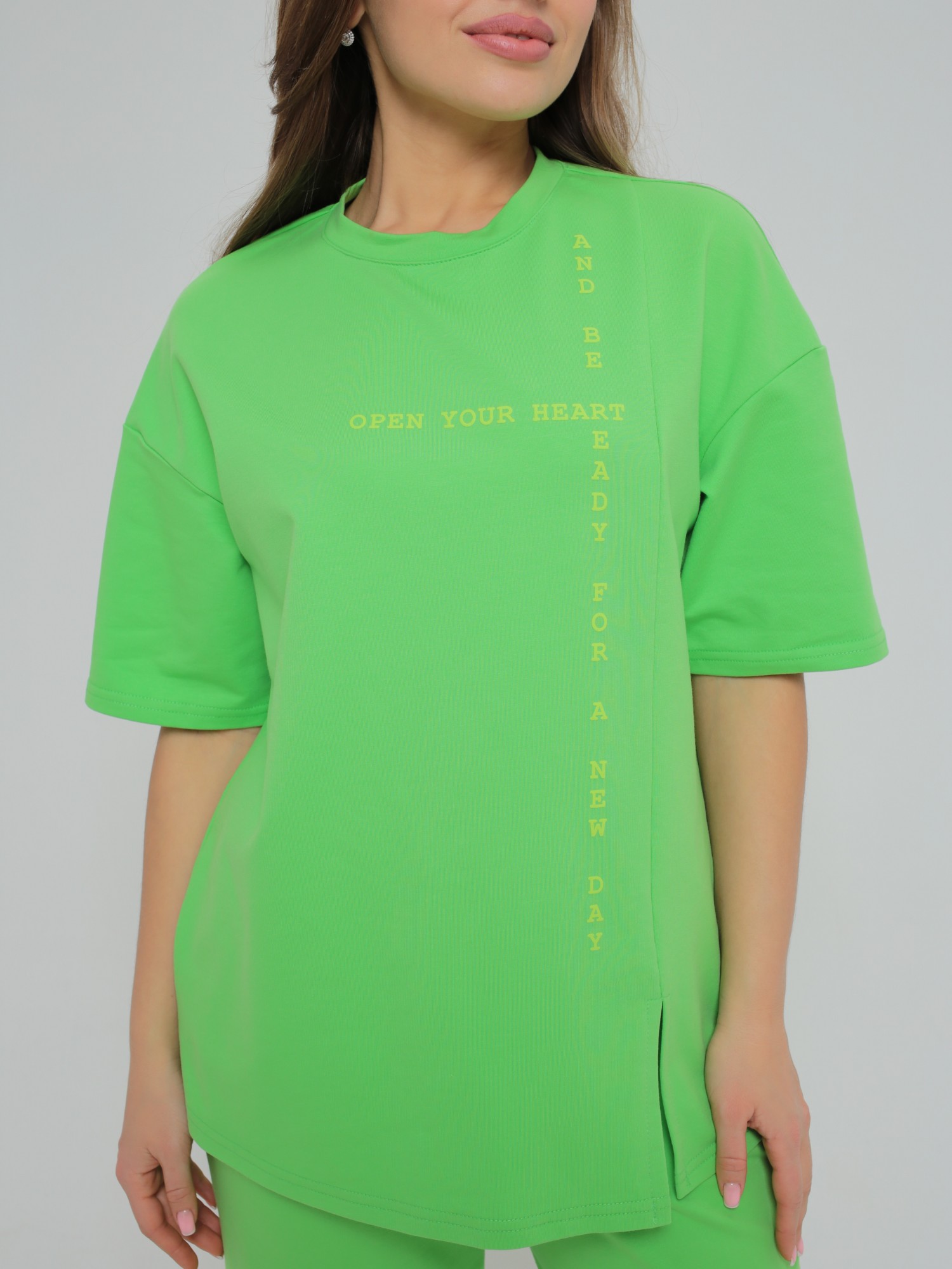 Футболка – с короткими втачными рукавами, горловиной овальной формы, обработанной втачной планкой, и принтом на полочке. Полочка – из двух частей, асимметричных относительно центра, и с разрезом в соединительном шве.