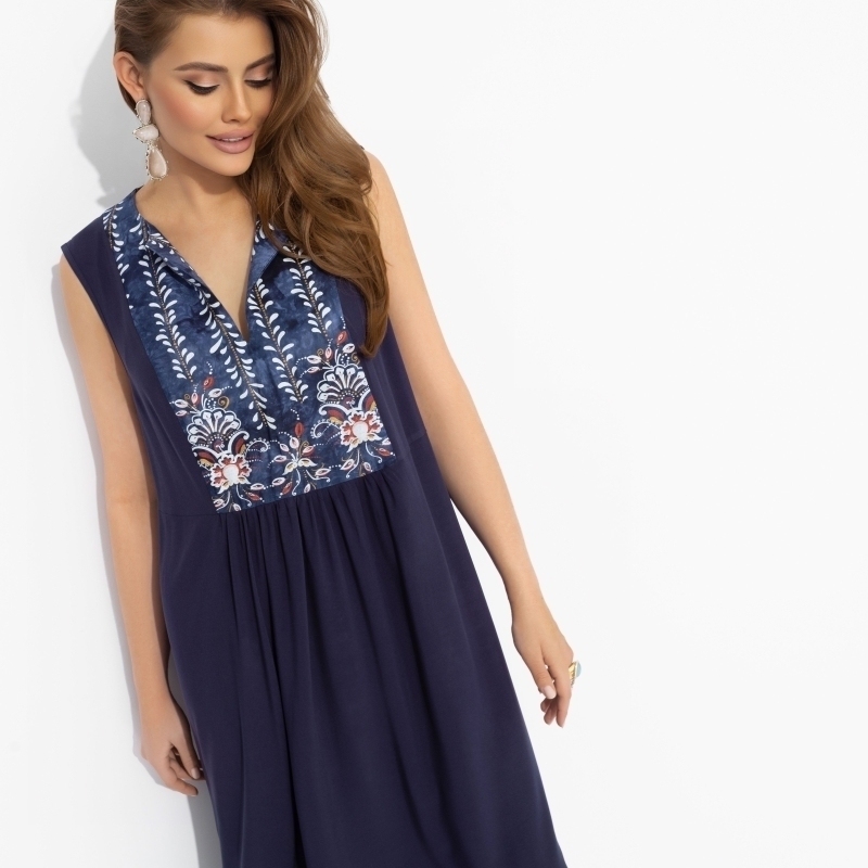 Он просто смотрел — долго, будто впервые. Её силуэт в этом платье был как загадка: прямая линия, свободный ход ткани, этнический акцент на груди, будто вышивка с далёкого восточного базара. Весь мир стал фоном. Он — тоже.Платье прямого силуэта в длине миди. Свободная посадка. Есть разрезы по бокам изделия. Платье дополнено акцентным материалом в зоне декольте.