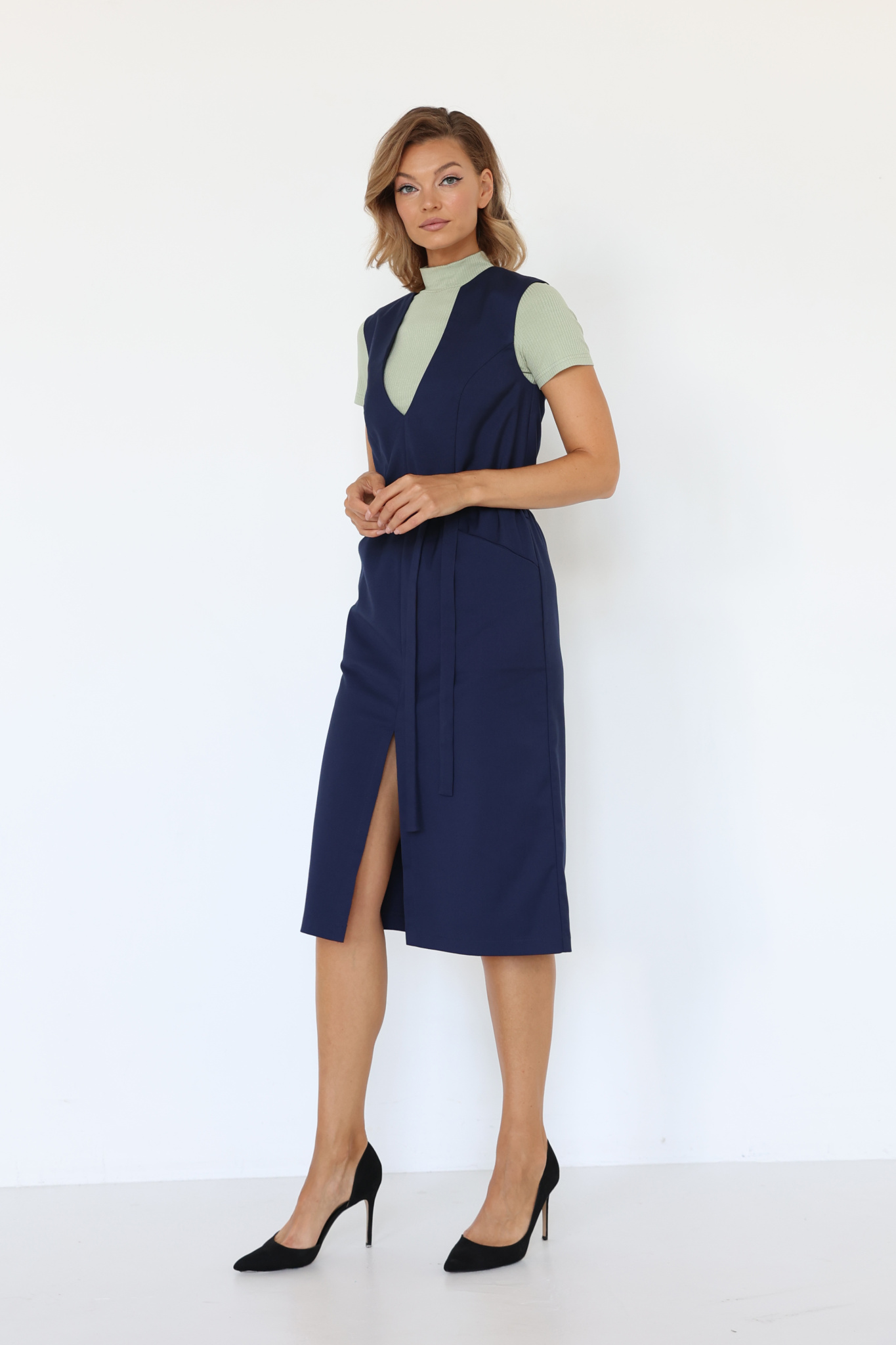 Сарафан строгого кроя с V-образным вырезом и разрезом. Накладные карманы, пояс в комплекте.