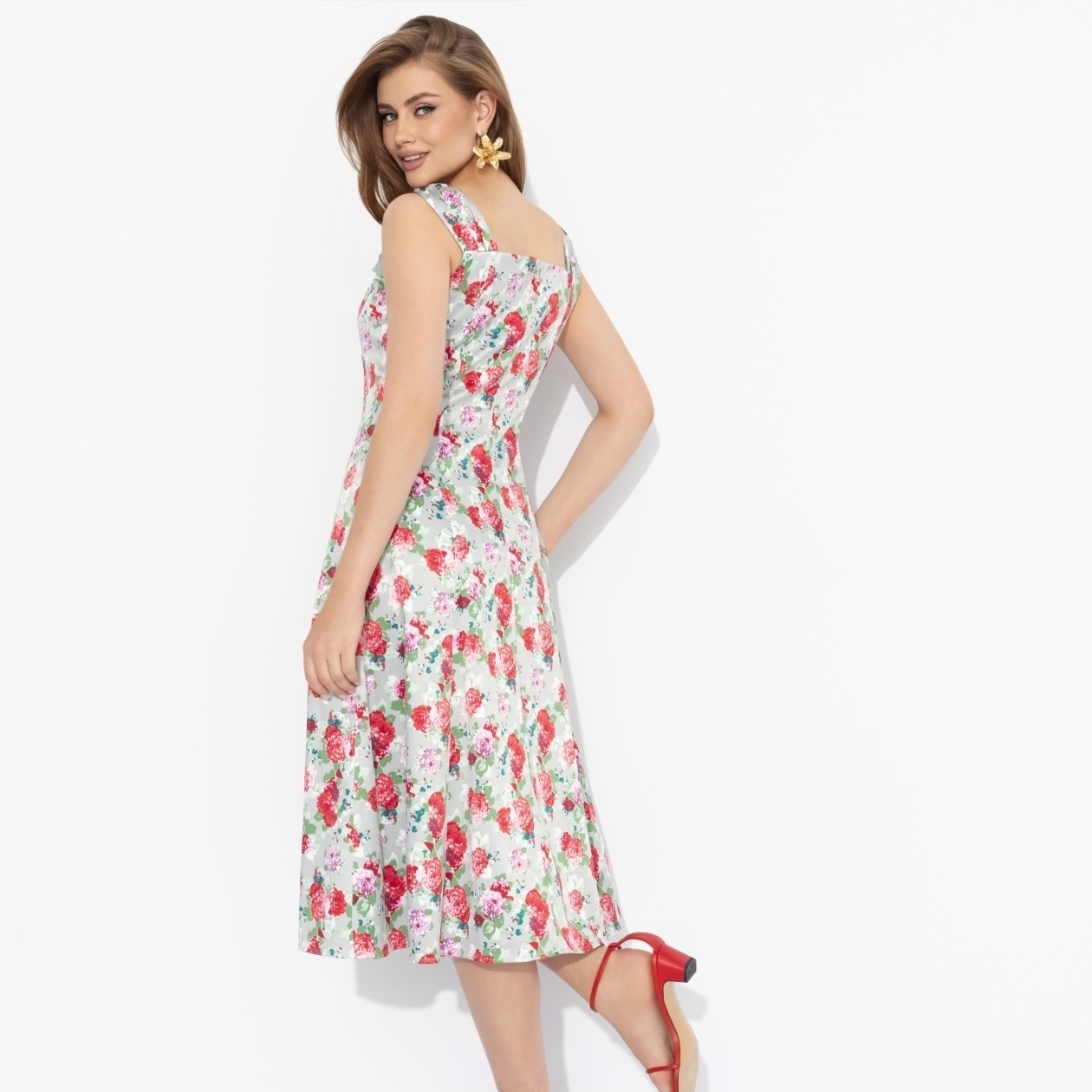 Проснуться от пения птиц, легкого ветерка из открытого окна и аромата свежеприготовленных пончиков. Атмосфера загородного дома пленит тебя с детства. Платье с цветочным узором ЧАРУТТИ поможет окунуться в любимый флер роскошных образов для легких прогулок. Приталенный силуэт, длина миди. Отвороты в зоне декольте. Широкие бретели в тон основного материала изделия. Есть карманы. Платье украшено пуговицами. Застегивается на скрытую молнию.