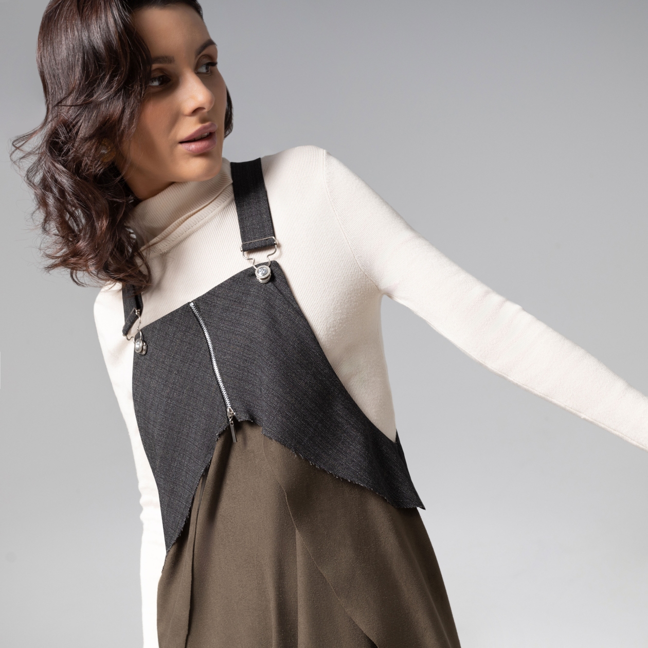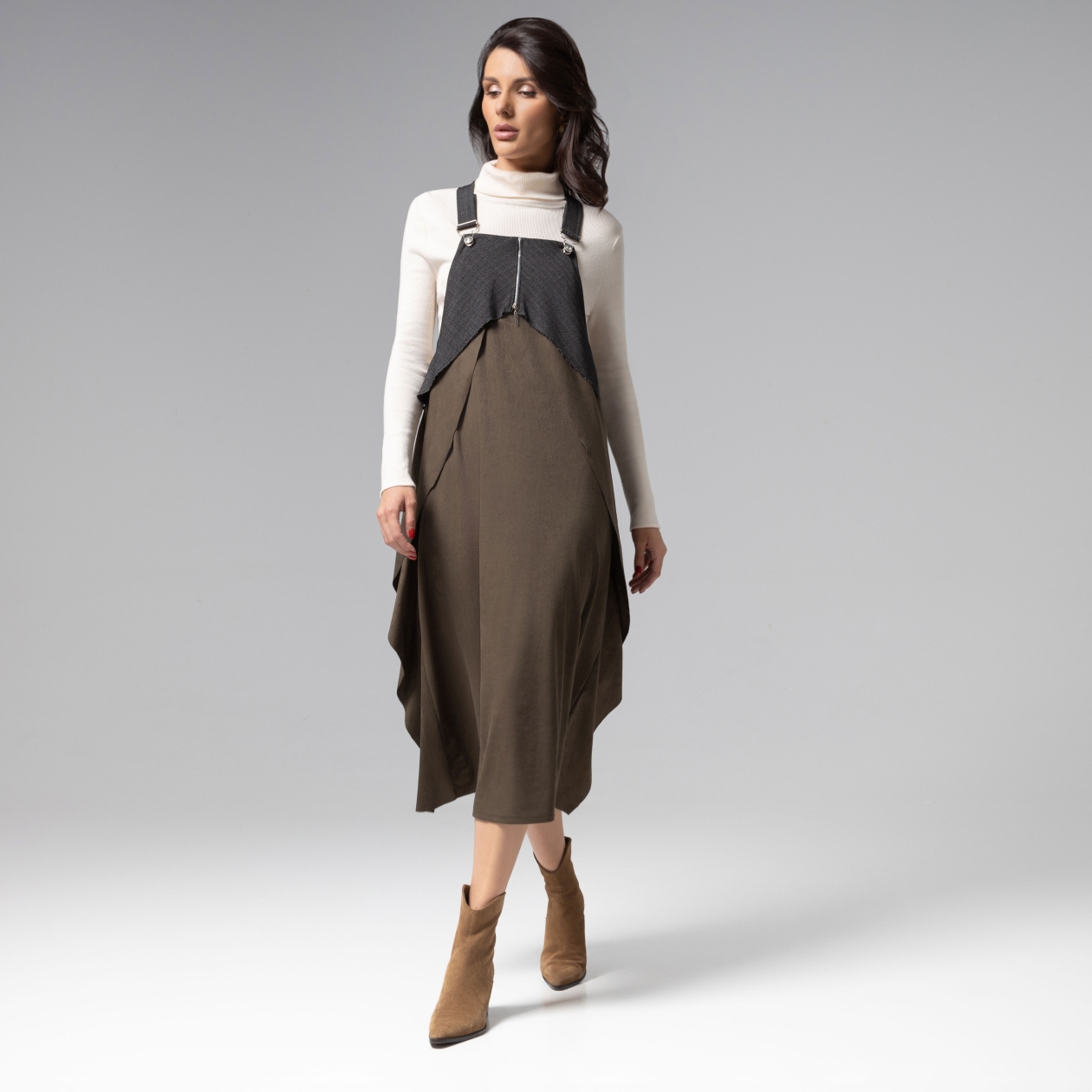 Сарафан-миди в оттенках хаки: авангардная элегантность. Свободный новаторский крой, сочетающий трендовую экозамшу и костюмную ткань премиального качества, создаёт архитектурный силуэт со шлейфом восточной философии. Воздушные рюши по бокам подчёркивают игру света на сложной поверхности ткани. Сарафан ЧАРУТТИ представляет собой манифест роскошного casual, где комфортный крой встречается с нетривиальным дизайном.