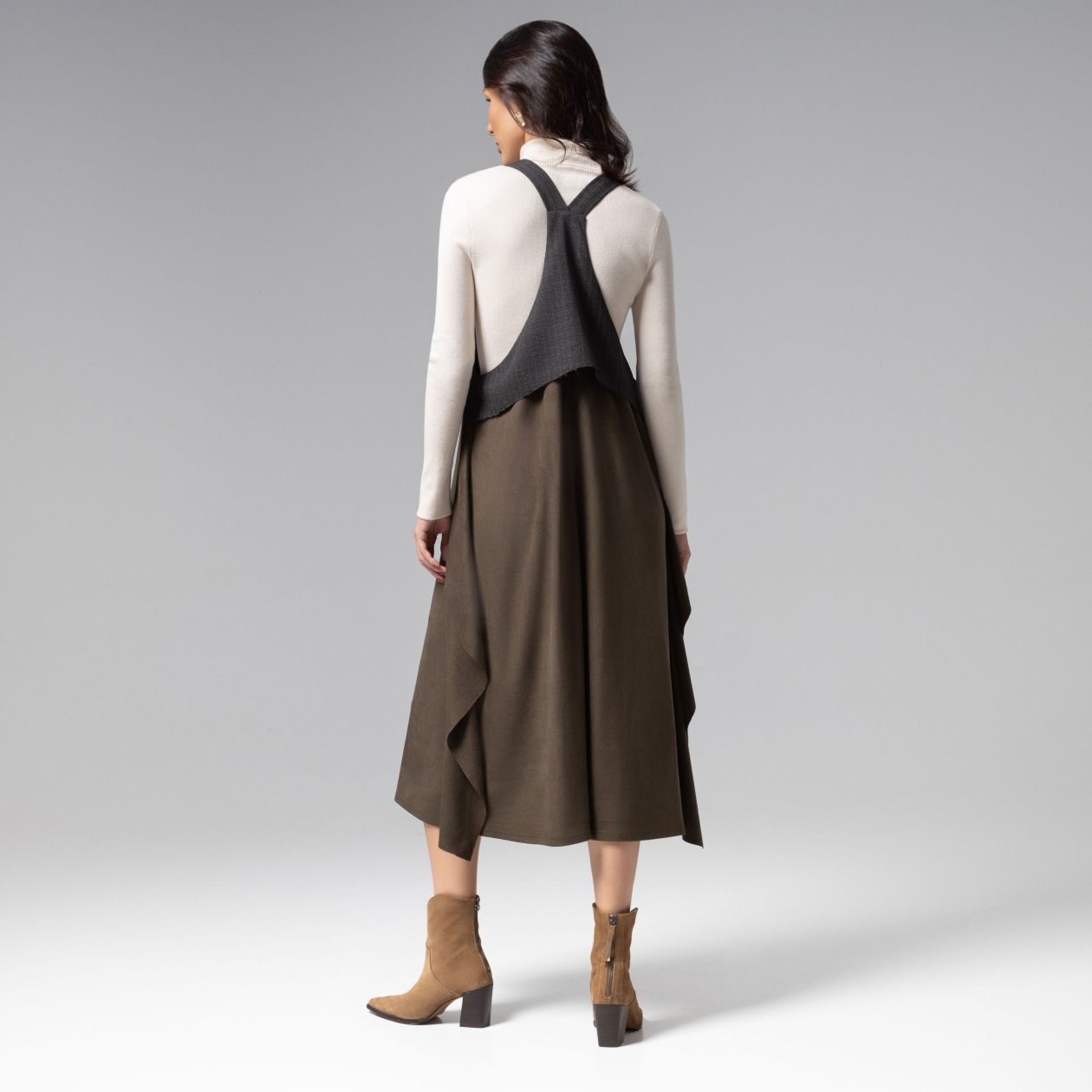 Сарафан-миди в оттенках хаки: авангардная элегантность. Свободный новаторский крой, сочетающий трендовую экозамшу и костюмную ткань премиального качества, создаёт архитектурный силуэт со шлейфом восточной философии. Воздушные рюши по бокам подчёркивают игру света на сложной поверхности ткани. Сарафан ЧАРУТТИ представляет собой манифест роскошного casual, где комфортный крой встречается с нетривиальным дизайном.