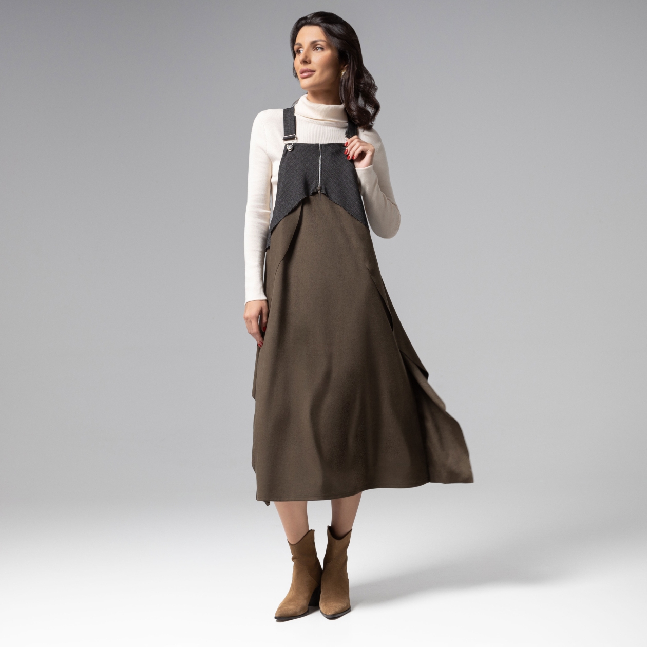 Сарафан-миди в оттенках хаки: авангардная элегантность. Свободный новаторский крой, сочетающий трендовую экозамшу и костюмную ткань премиального качества, создаёт архитектурный силуэт со шлейфом восточной философии. Воздушные рюши по бокам подчёркивают игру света на сложной поверхности ткани. Сарафан ЧАРУТТИ представляет собой манифест роскошного casual, где комфортный крой встречается с нетривиальным дизайном.