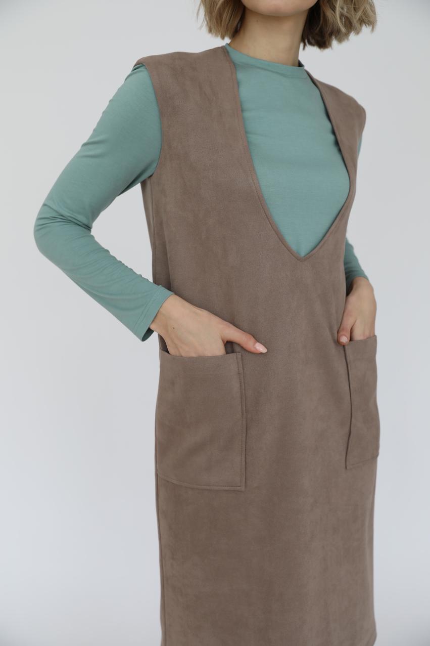 Сарафан из искусственной замши с глубоким V-вырезом горловины и накладными карманами.