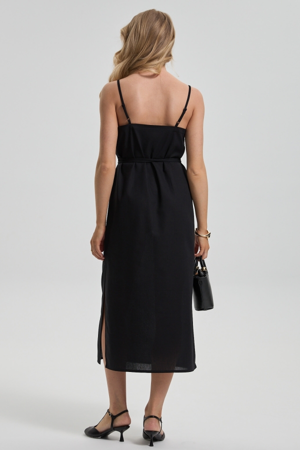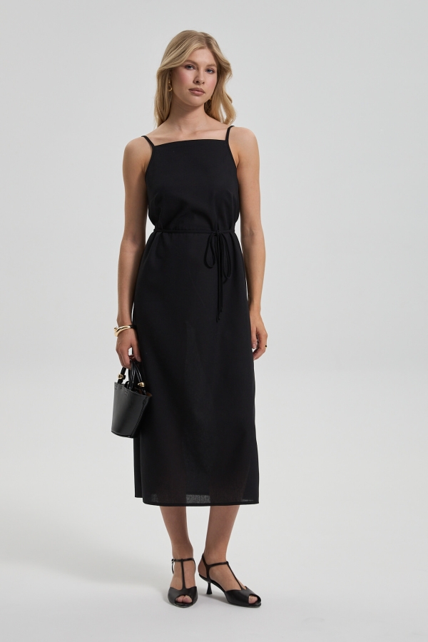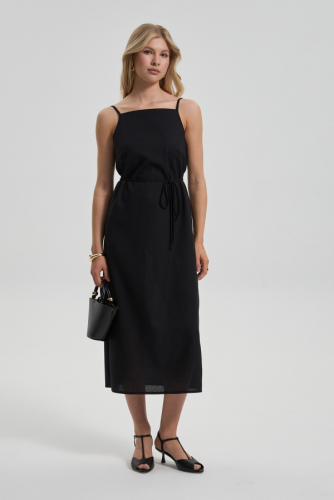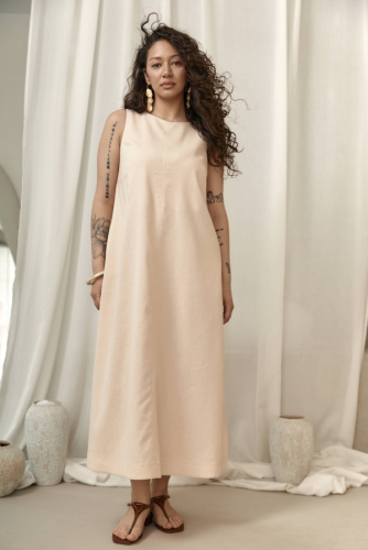 Сарафан базового цвета из льняного полотна. Модель свободного прямого силуэта. Разрезы по бокам. На талии тонкий пояс из основной ткани, прикрепленные в боковые швы. Бретели регулируемые.