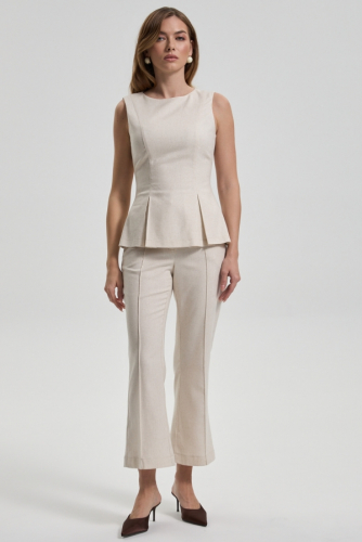 Сарафан базового цвета из льняного полотна. Модель свободного прямого силуэта. Разрезы по бокам. На талии тонкий пояс из основной ткани, прикрепленные в боковые швы. Бретели регулируемые.