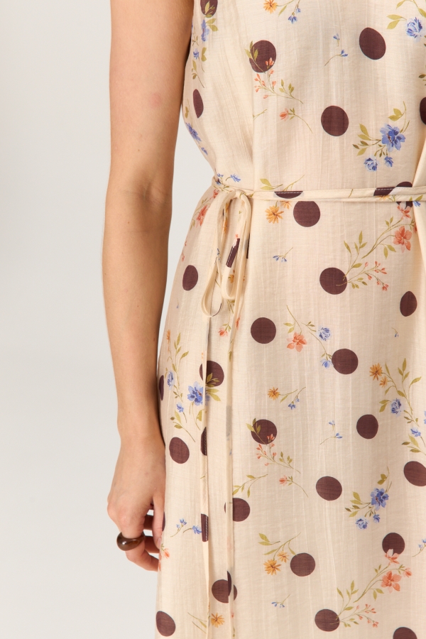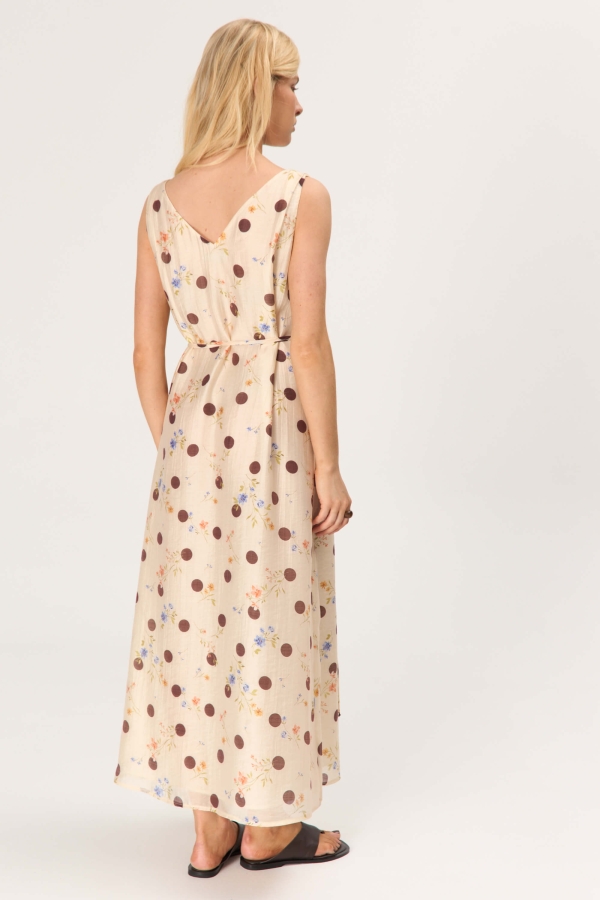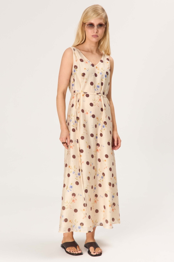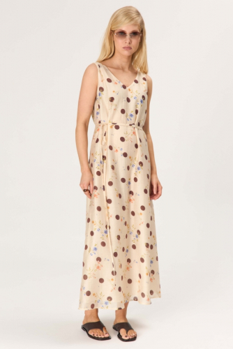 Сарафан длины миди из воздушной, вискозной органзы-вуаль в трендовом принте. Модель свободного силуэта. По переду V-образный вырез горловины, на плечах декоративные защипы. Пояс из основной ткани. Изделие на подкладке из воздушной вискозы.