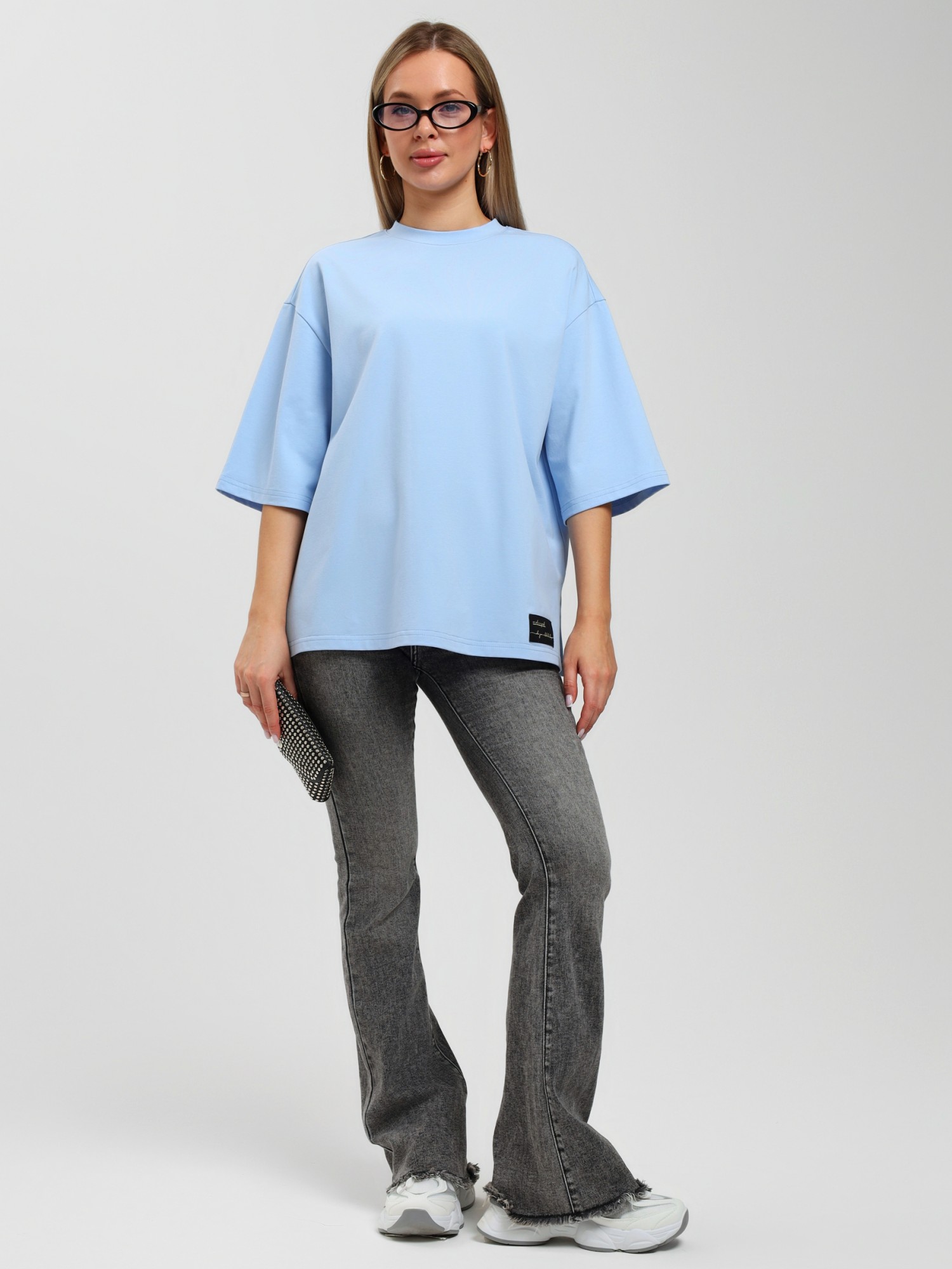 Футболка молодежная из гладкокрашенного полотна «кулирка с лайкрой», свободного покроя, со спущенной линией плеча, втачными рукавами длиной до локтя, горловиной овальной формы, обработанной втачной планкой. Изделие дополнено декоративной нашивкой, в боковых швах выполнены разрезы.