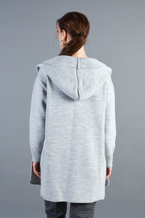Кардиган свободного силуэта с капюшоном, со спущенной линией плеча и длинным рукавом. На передней части изделия выполнены карманы. Низ изделия и низ рукава оформлены резинкой. Изделие выполнено из мягкой меланжевой пряжи.