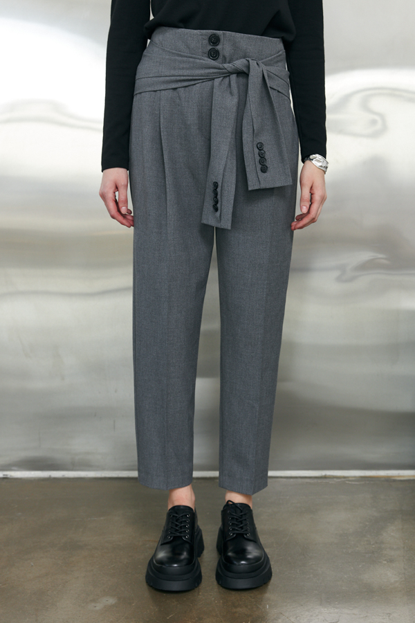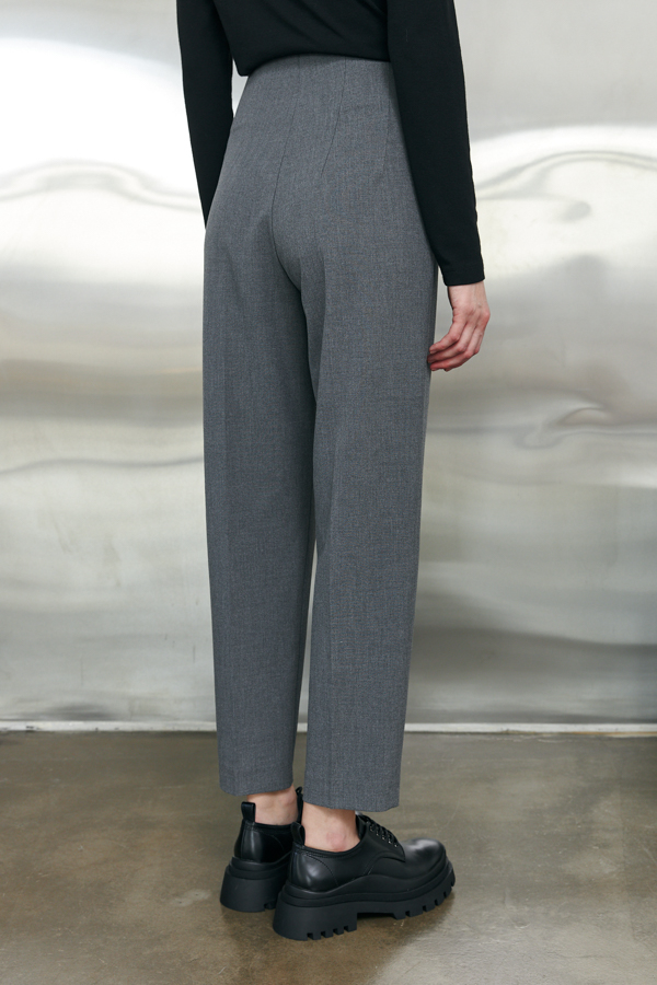Брюки из костюмной ткани, чуть зауженные книзу. Свободный силуэт с завышенной талией. На передней половинке по линии талии застрочены складки. На задней половинке - талиевые вытачки. Застёжка на молнию-гульфик и пуговицы. В боковых швах декоративные вставки в авангардном стиле.