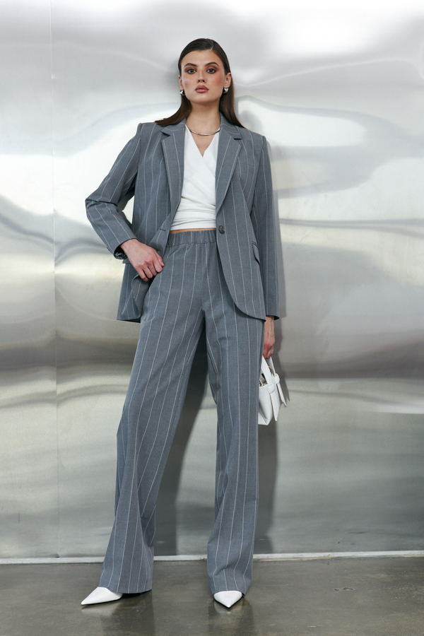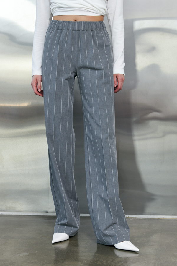 Брюки прямого силуэта из костюмной ткани. Пояс притачной с эластичной резиной.
