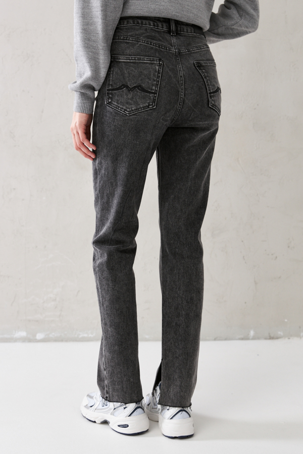 Брюки из эластичного денима выполнены по классической джинсовой технологии (варка с эффектом легкого выбеливания). Прямой классический крой. На задней части брюк выполнены накладные карманы, на передней - карманы с подкройным бочком. Притачной пояс со шлёвками. Застёжка на молнию-гульфик и пуговицу. По внутренней части брюк разрезы. Низ изделия имеет стильный необработанный край.