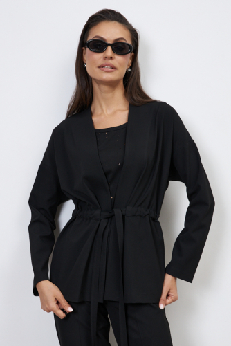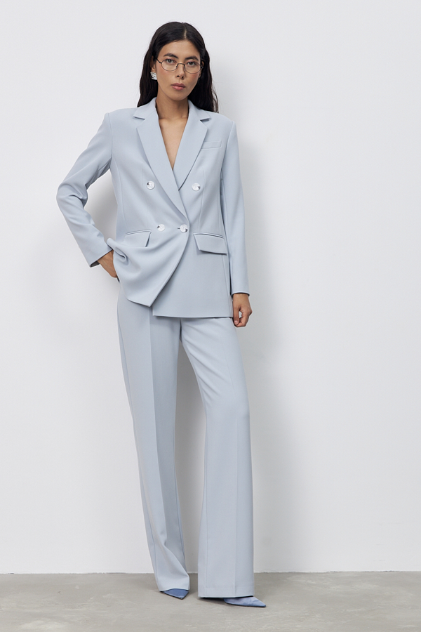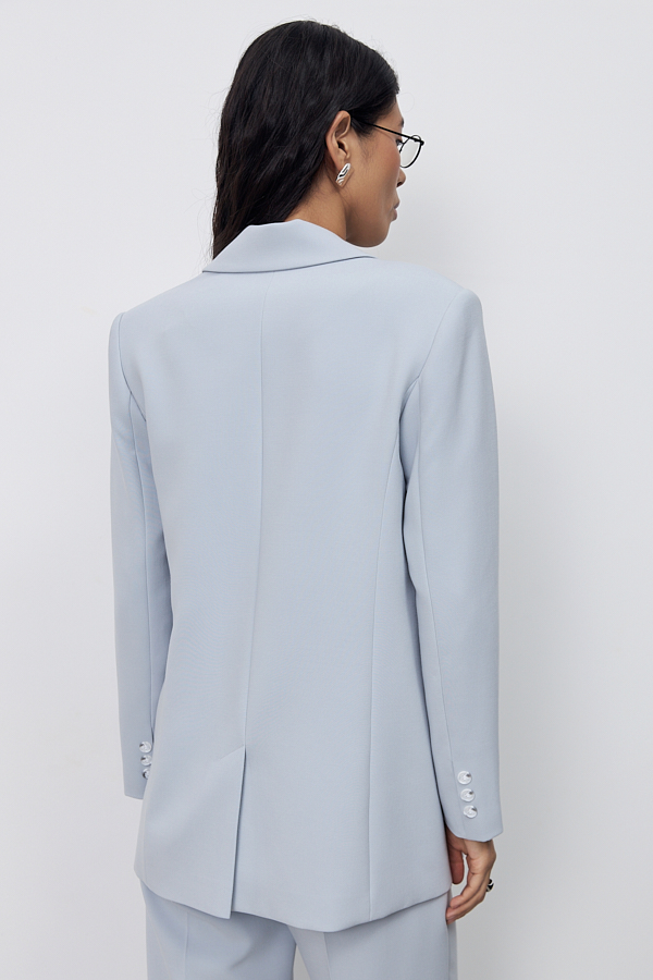 Двубортный жакет из костюмной ткани. Изделие полуприлегающего силуэта с английским воротником и застежкой на пуговицы. На передней части жакета выполнен нагрудный карман с листочкой и карманы в рамку с клапаном. По центру задней части выполнена шлица - элемент декоративный и необходимый. Обеспечивает свободу движения, добавляет шику и элегантности. Втачной длинный рукав, снизу имитация шлицы с пуговицами. Изделие идеально держит форму, имеет четкую линию плеча благодаря плечевым накладкам. Жакет на подкладке.