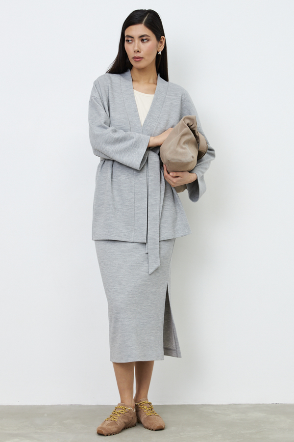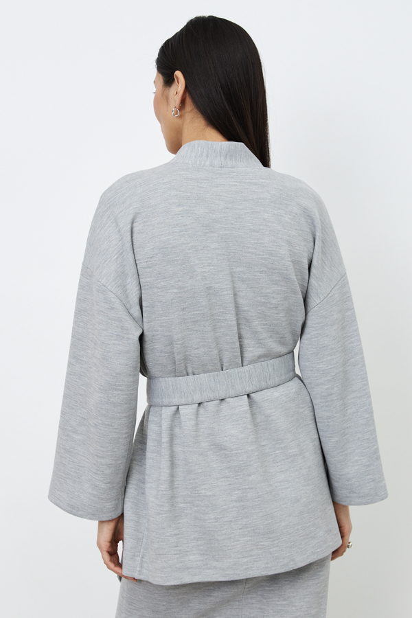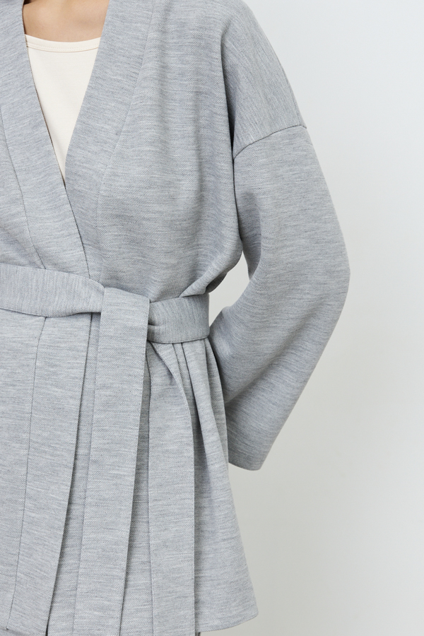 Кардиган из меланжевого эластичного полотна. Свободный силуэт с притачной планкой. Втачной широкий рукав в спущенную пройму. В комплекте пояс, позволяющий создавать приталенный силуэт.