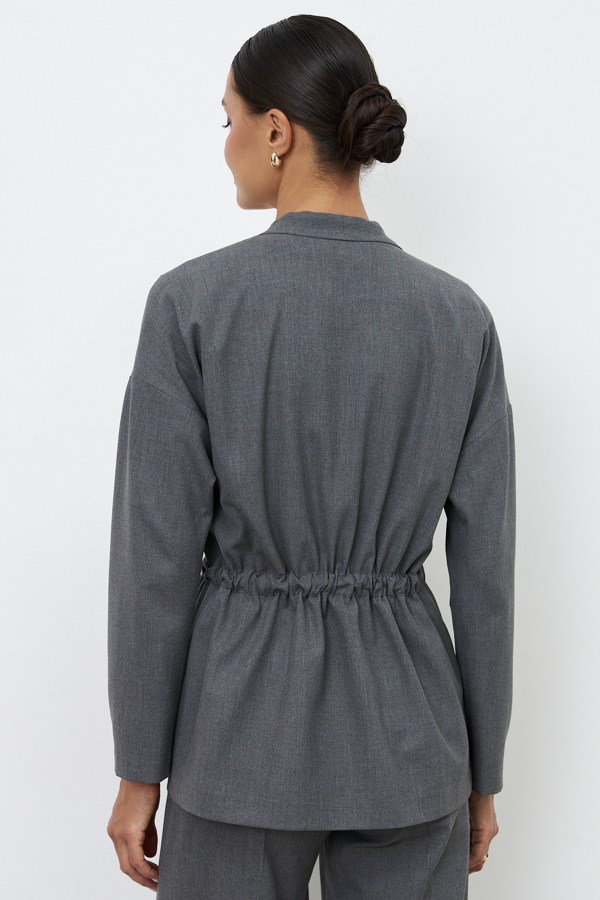 Жакет из костюмной ткани свободного силуэта. По линии талии изделие затягивается на кулиску. Цельнокроеная стойка, переходящая в борт, визуально делает фигуру стройнее. Втачной длинный рукав в спущенную пройму.
