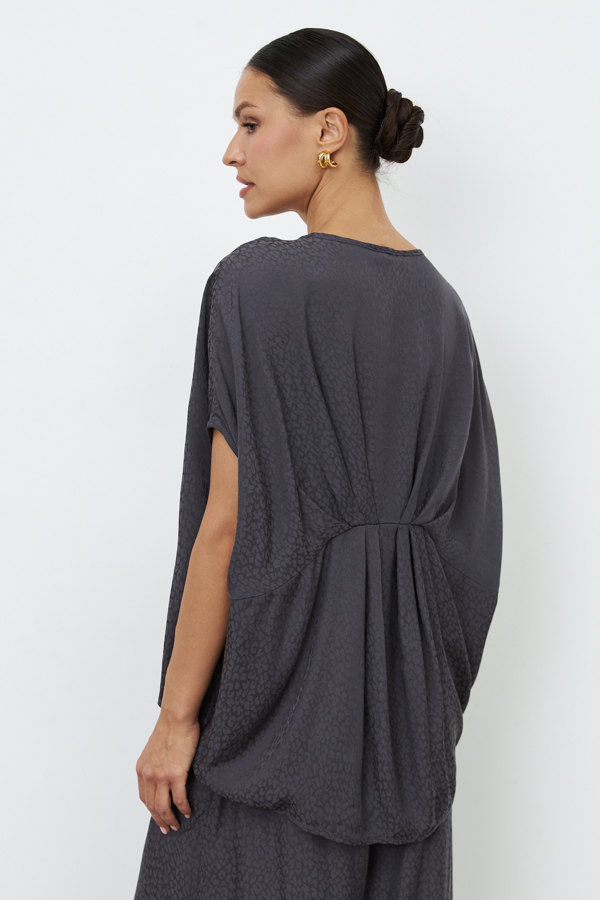Блуза из вискозной ткани. Свободный крой асимметричной длины (спинка удлинена относительно переда). Спущенное плечо. Линия проймы, линия горловина и низ изделия окантованы косой бейкой из основной ткани. Изюминкой являются оригинальные складки на передней и задней части изделия.