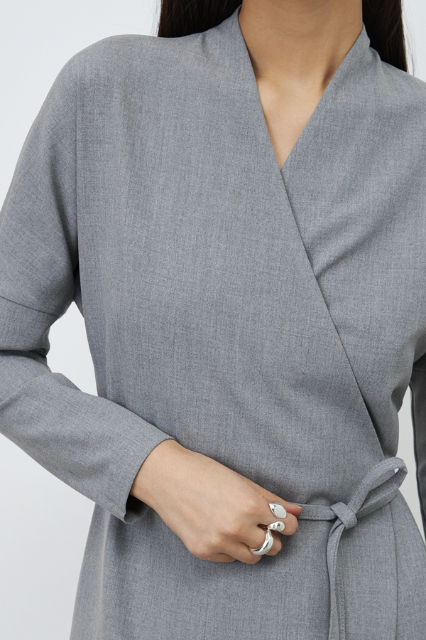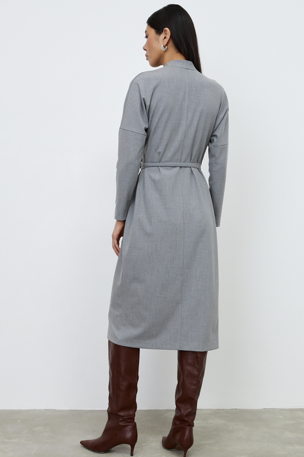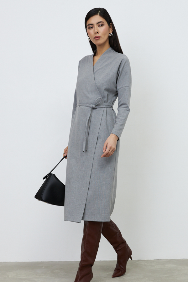 Платье прямого силуэта из плательной ткани. Глубокий V-образный вырез горловины плавно переходит в запах, фиксируется притачным поясом. Втачной длинный рукав в спущенную пройму.