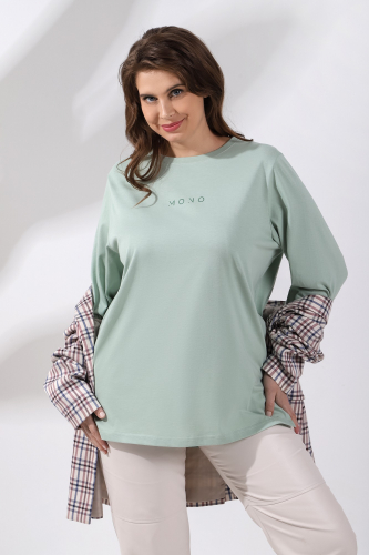Футболка из гладкокрашеного трикотажного полотна «кулирка» с эффектом «варенки», свободного покроя, горловиной овальной формы, обработанной притачной планкой. Низ рукавов и изделия состоит из двух частей, одна из которых с необработанным краем, другая с подгибкой и соединенных между собой накладным швом.