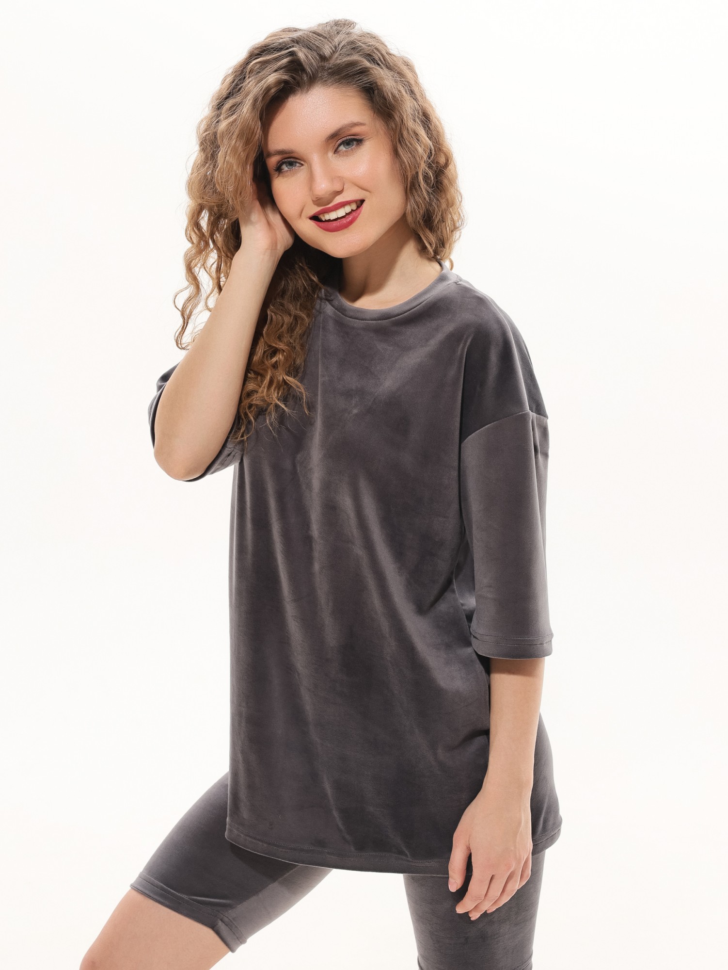 Костюм из гладкокрашеного трикотажного полотна «велюр стрейч», состоящий из футболки и леггинсов. Футболка – удлиненная, свободного покроя, со спущенной, линией плеча, короткими втачными рукавами, горловиной овальной формы, обработанной втачной планкой.Леггинсы – длиной до колен, с эластичной тесьмой по талии.