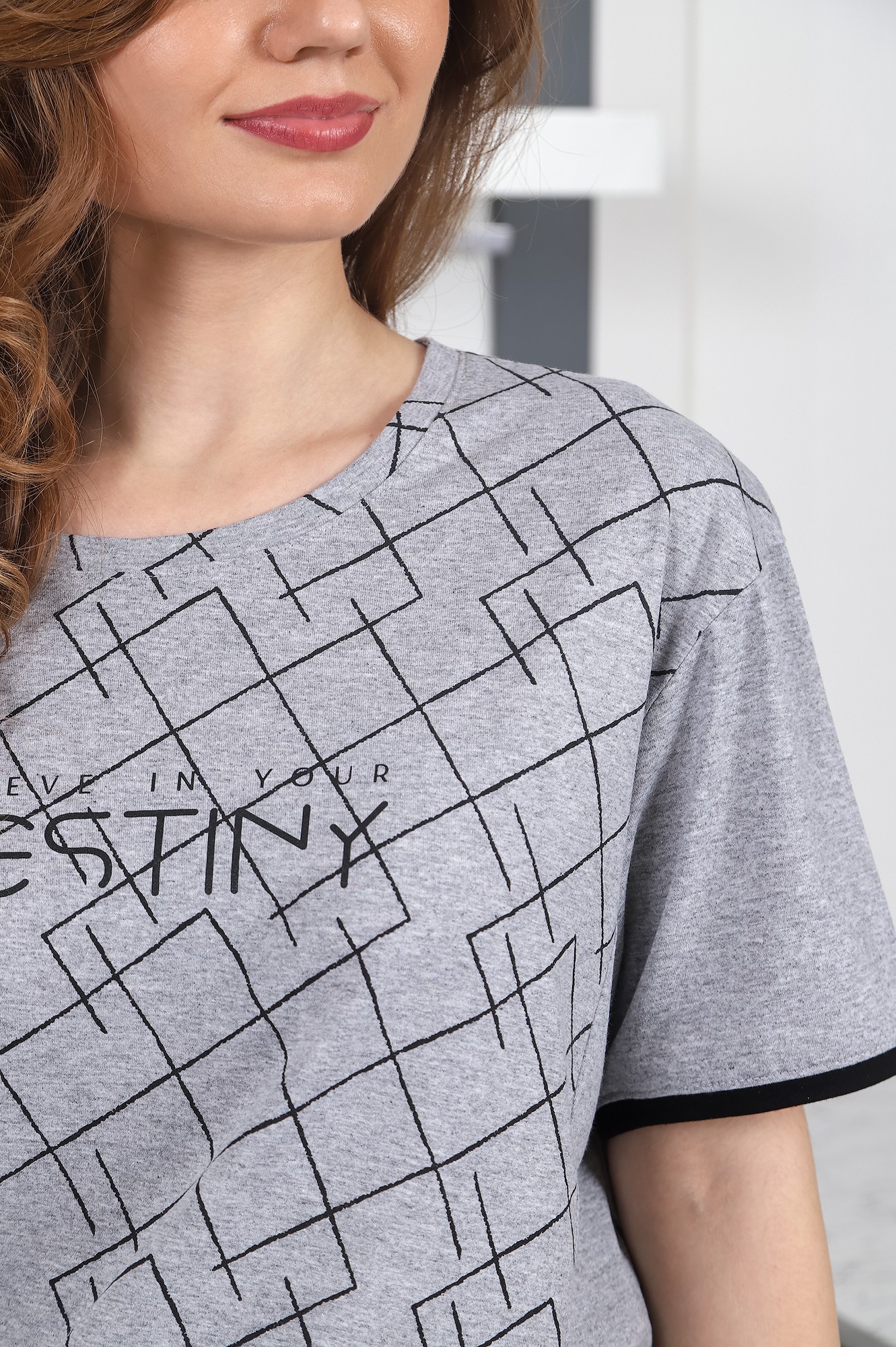 Костюм молодежный из трикотажного полотна «кулирка-меланж» в комбинации гладкокрашенного полотна и полотна с набивным рисунком, состоящий из футболки и брюк. Футболка – из полотна с набивным рисунком, с короткими втачными рукавами, слегка удлиненными плечевыми швами, горловиной овальной формы, треугольными вставками в боковых швах и принтом в центре переда, выполненным методом «шелкографии». Рукава и треугольные вставки выполнены из гладкокрашеного полотна. Горловина обработана притачной бейкой из основного материала, нижние срезы рукавов - из отделочного черного цвета. Брюки – из полотна с набивным рисунком и декоративными вставками в боковых швах из гладкокрашеного полотна, укороченные, на притачном поясе с эластичной тесьмой внутри и карманами в боковых швах. Пояс – с декоративным шнурком из репсовой ленты черного цвета, вставленный через две обметанные петли спереди.