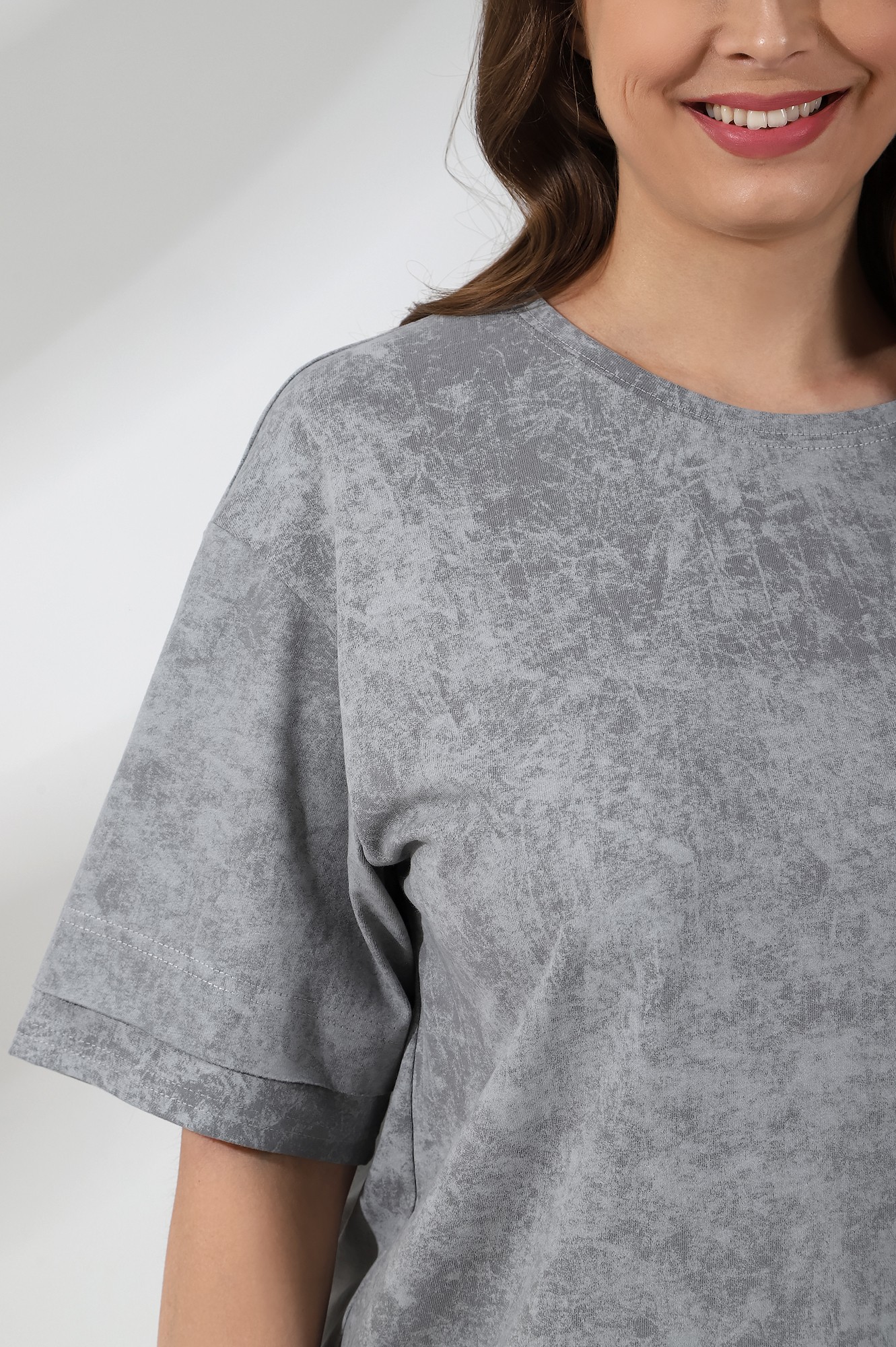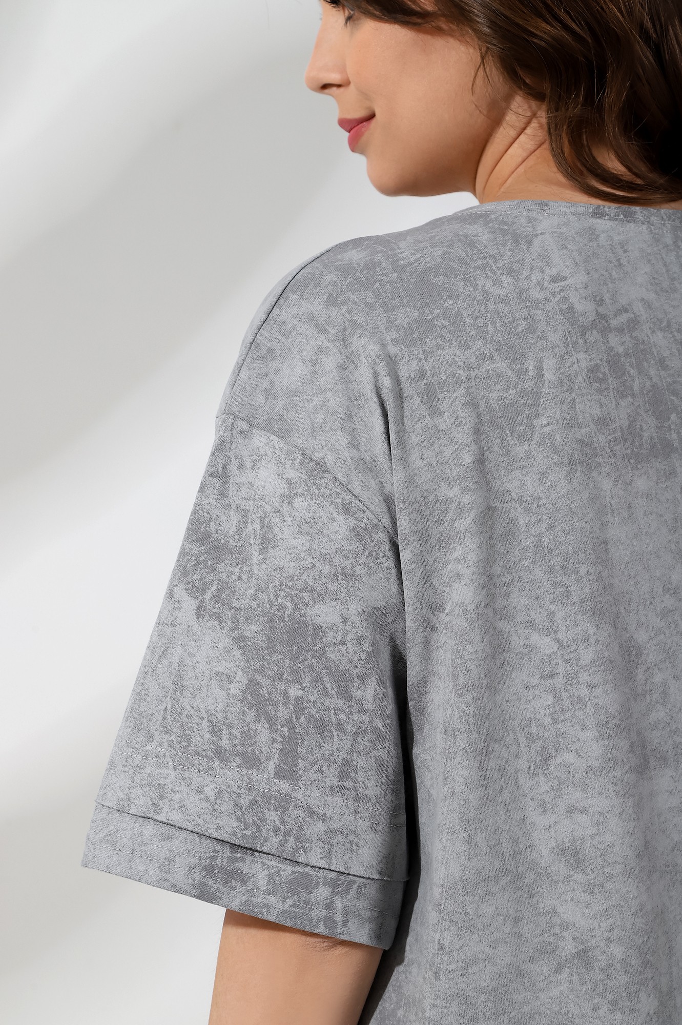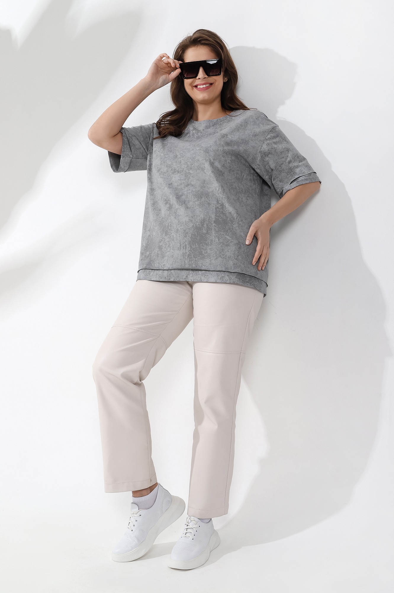 Футболка из гладкокрашеного трикотажного полотна «кулирка» с эффектом «варенки», свободного покроя, горловиной овальной формы, обработанной притачной планкой. Низ рукавов и изделия состоит из двух частей, одна из которых с необработанным краем, другая с подгибкой и соединенных между собой накладным швом.
