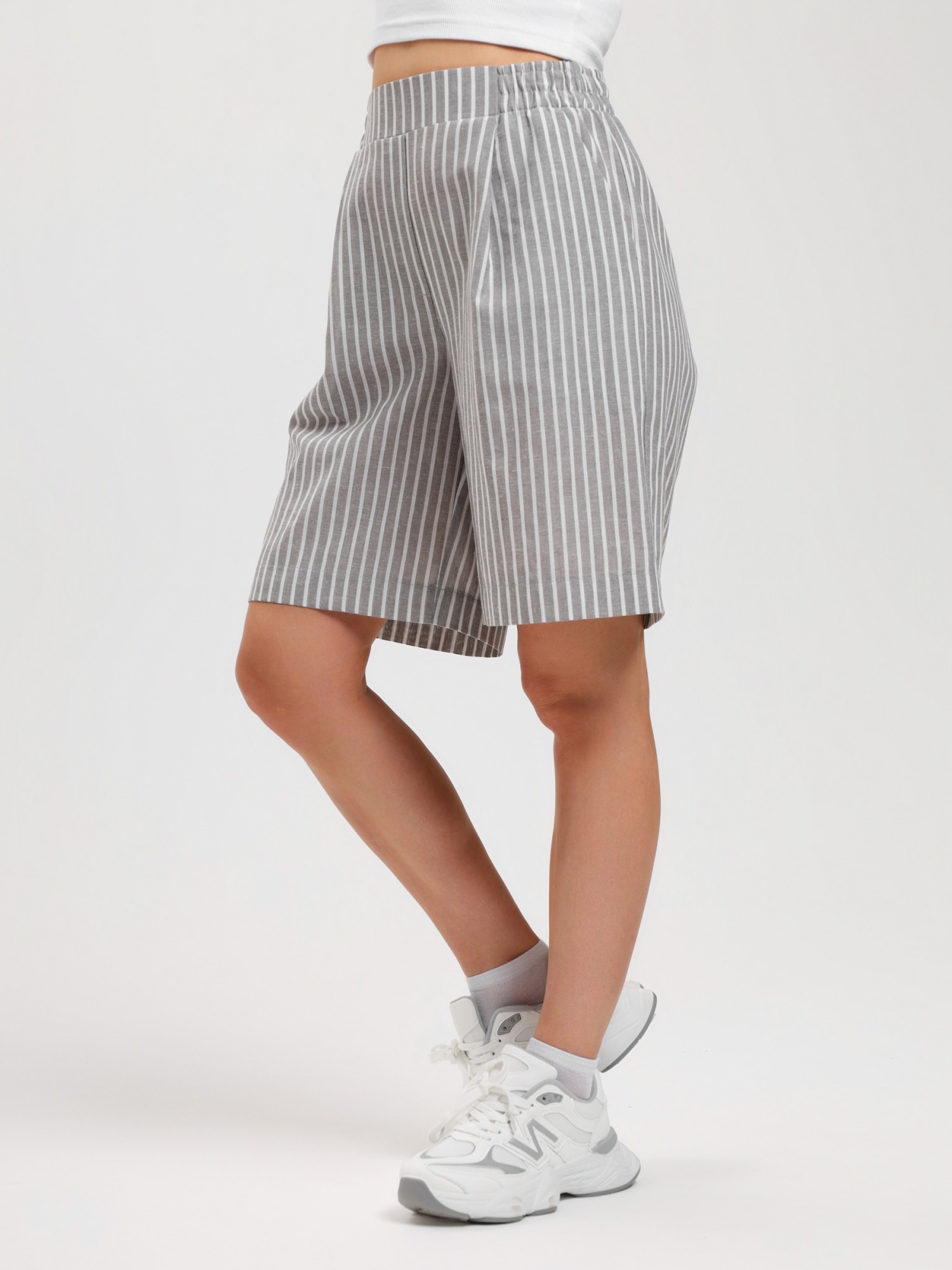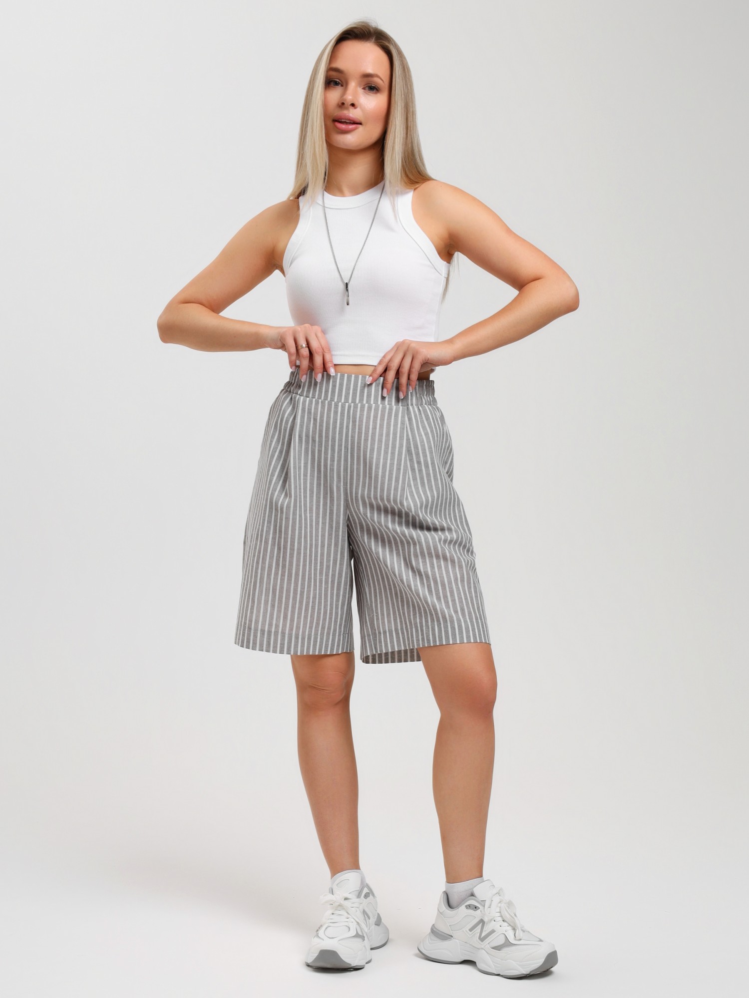 Шорты – свободные, с карманами в боковых швах, с двумя заложенными складками пот алии, на притачном поясе с эластичной тесьмой внутри. Средний шов передних половин обработан имитацией «гульфика».