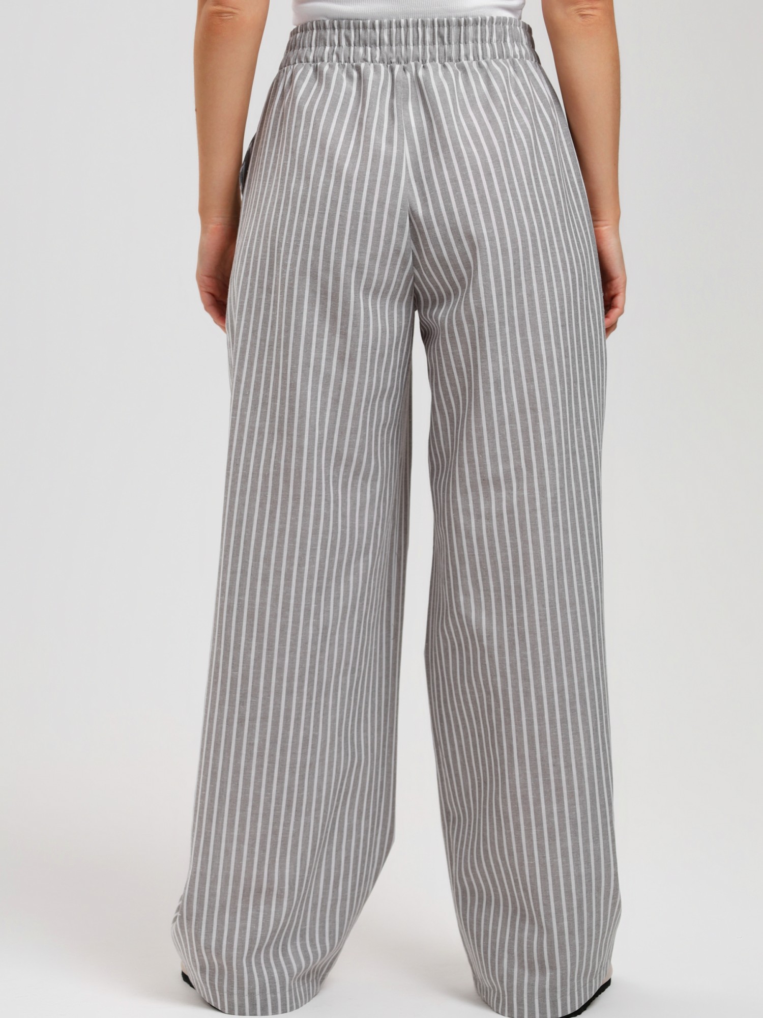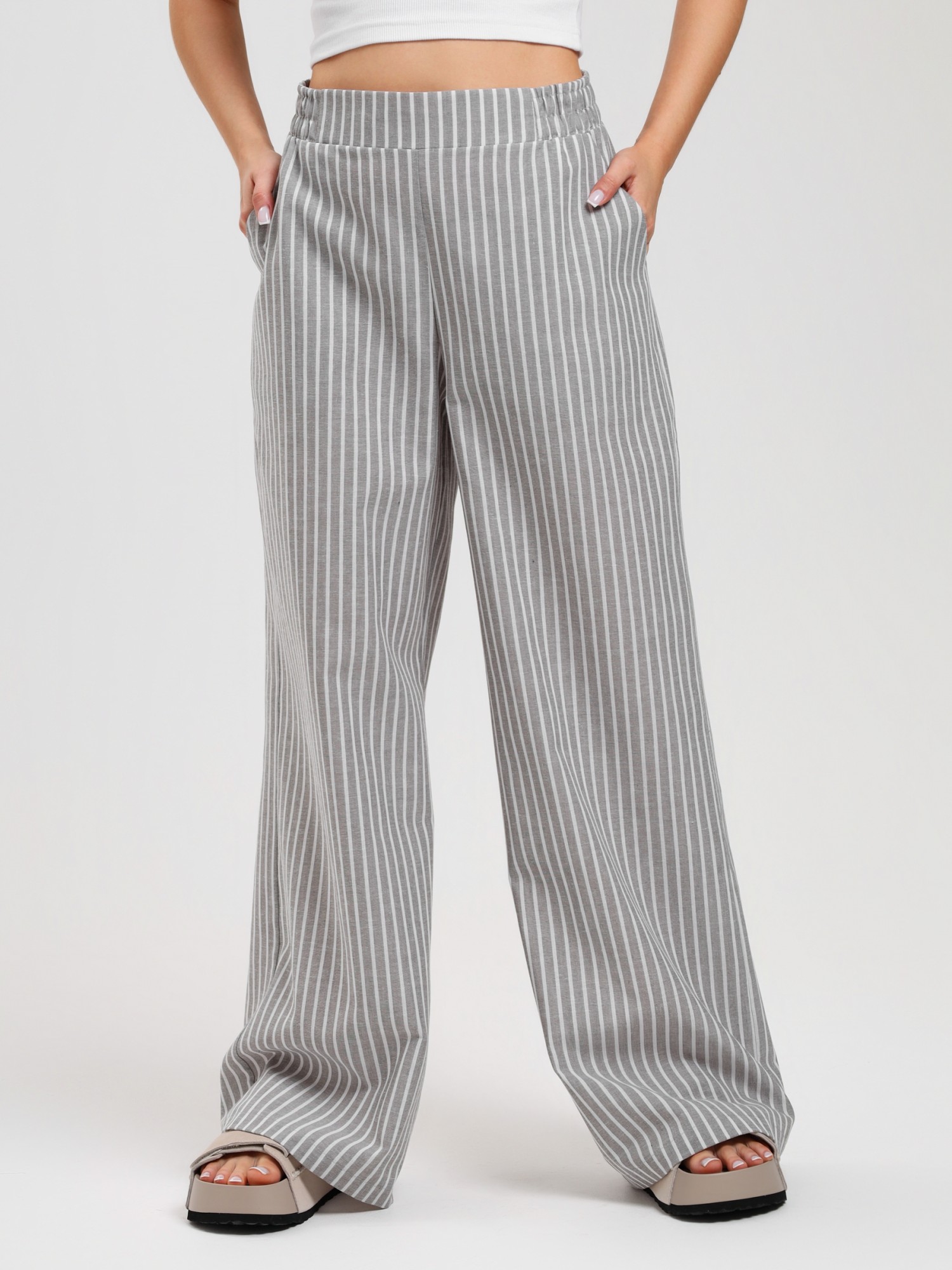 Брюки молодежные из тканого полотна с набивным рисунком в полоску, свободного покроя, с карманами в боковых швах, на притачном поясе с эластичной тесьмой внутри.