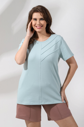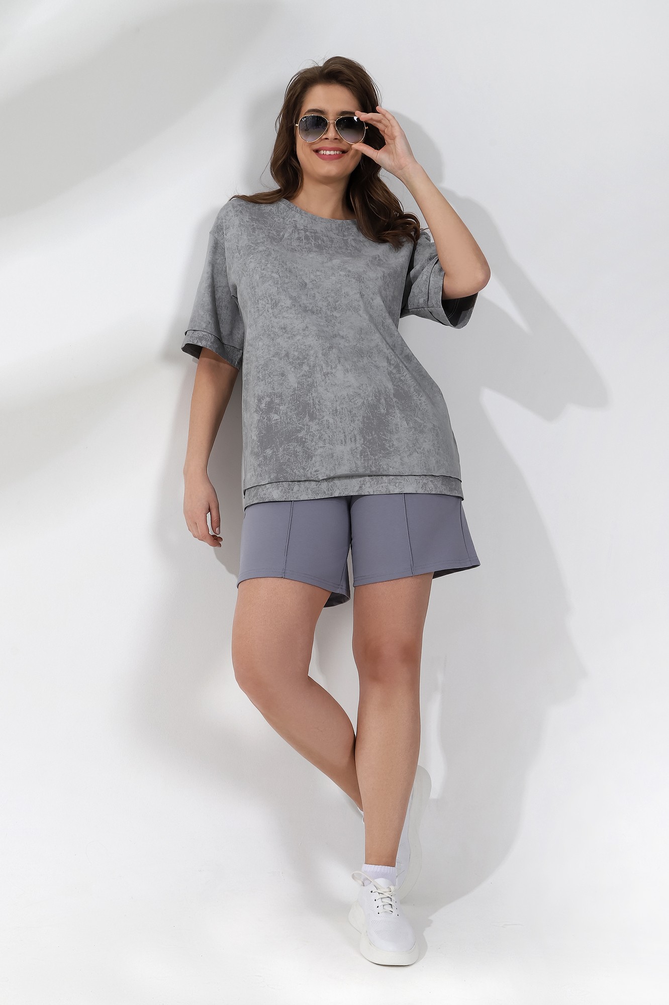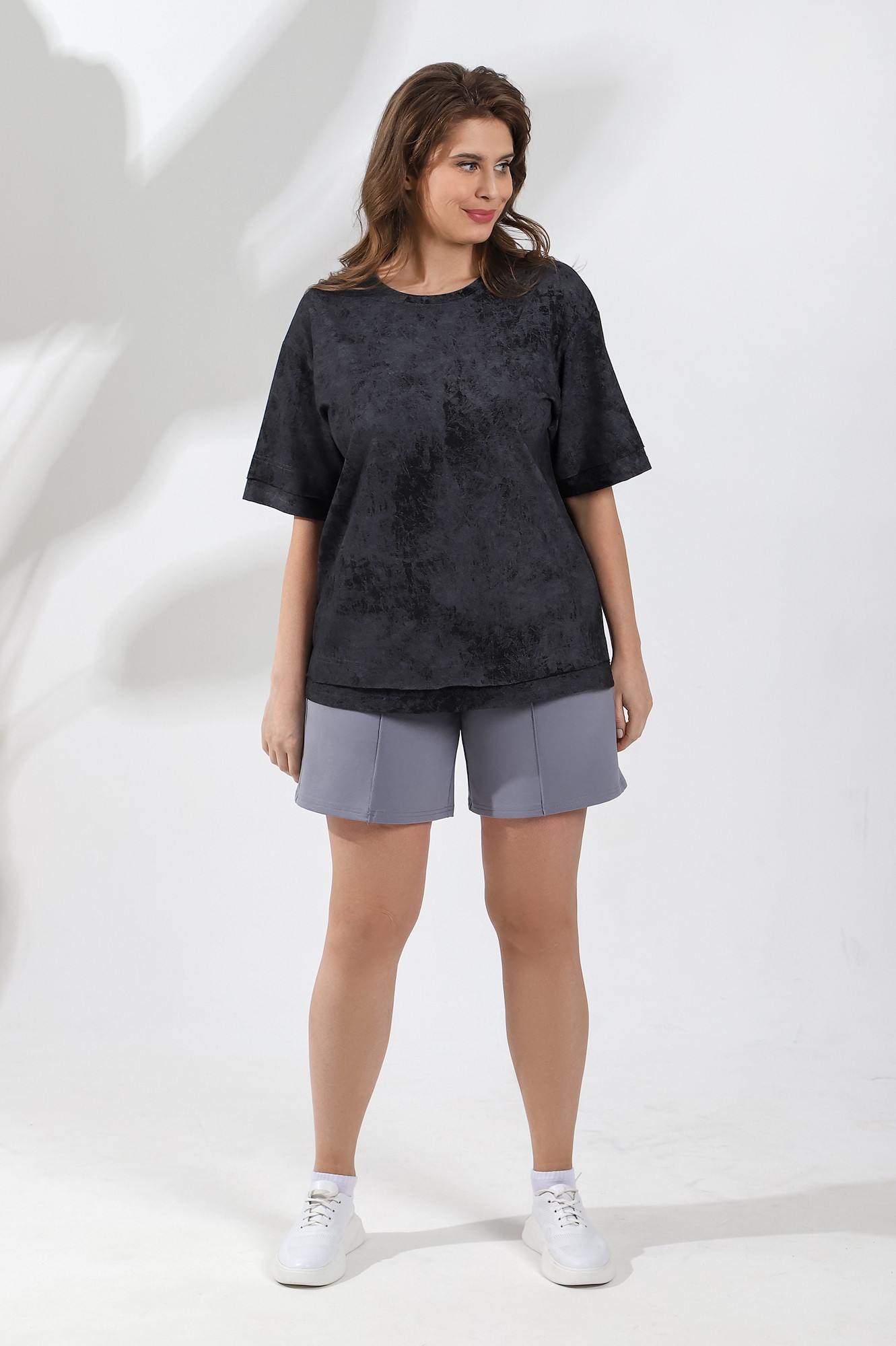 Шорты женские из гладкокрашеного трикотажного полотна «футер-двунитка», удлиненные и расширенные, на притачном поясе с эластичной тесьмой внутри и карманами в боковых швах. Передние половины шорт застрочены по центральным линиям.