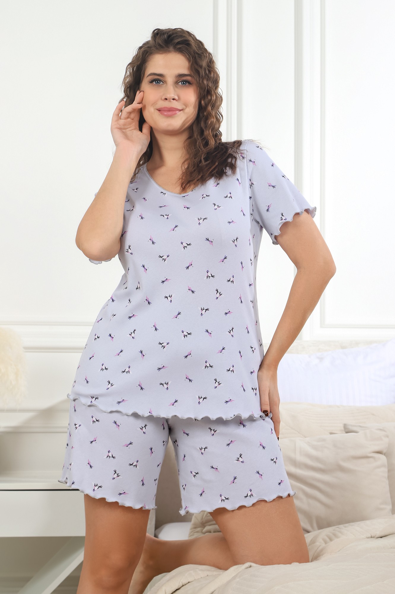 Пижама женская из трикотажного полотна «кашкорсе» с набивным рисунком, состоящая из футболки и шорт. Футболка - классического покроя, горловиной V-образной формы, окантованной основным материалом и украшенной декоративной строчкой «кроше». Нижние срезы рукавов и низ изделия обработаны узкой обметочной строчкой, создающей красивый волнистый край.Шорты – средней длины, свободные, с эластичной тесьмой по талии. Нижние срезы шорт обработаны узкой обметочной строчкой, создающей красивый волнистый край.