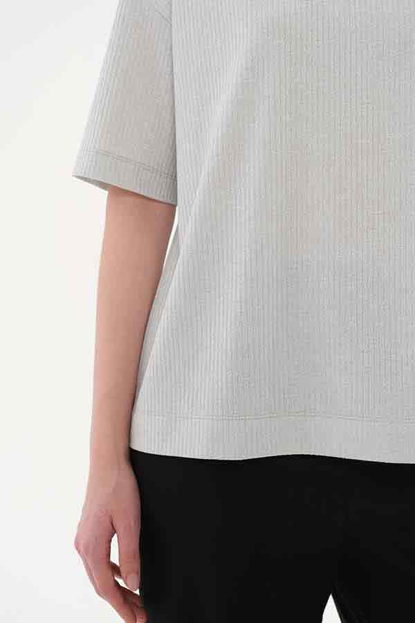 Джемпер из фактурного эластичного полотна с люрексом. Свободный силуэт со спущенной линией плеча и коротким рукавом. Вырез горловины окантован эластичной бейкой. В таблице размеров представлены параметры человека, а не изделия.