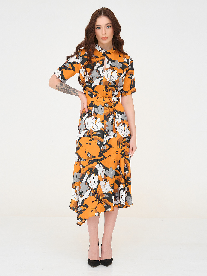 Спереди рельефы и вырез в среднем шве. Сзади в среднем шве потайная застёжка молния. Воротник стойка. По низу платья наклонный подрез, обработанный фигурным воланом. Талия подчёркнута поясом из основной ткани с обтяжной пряжкой.