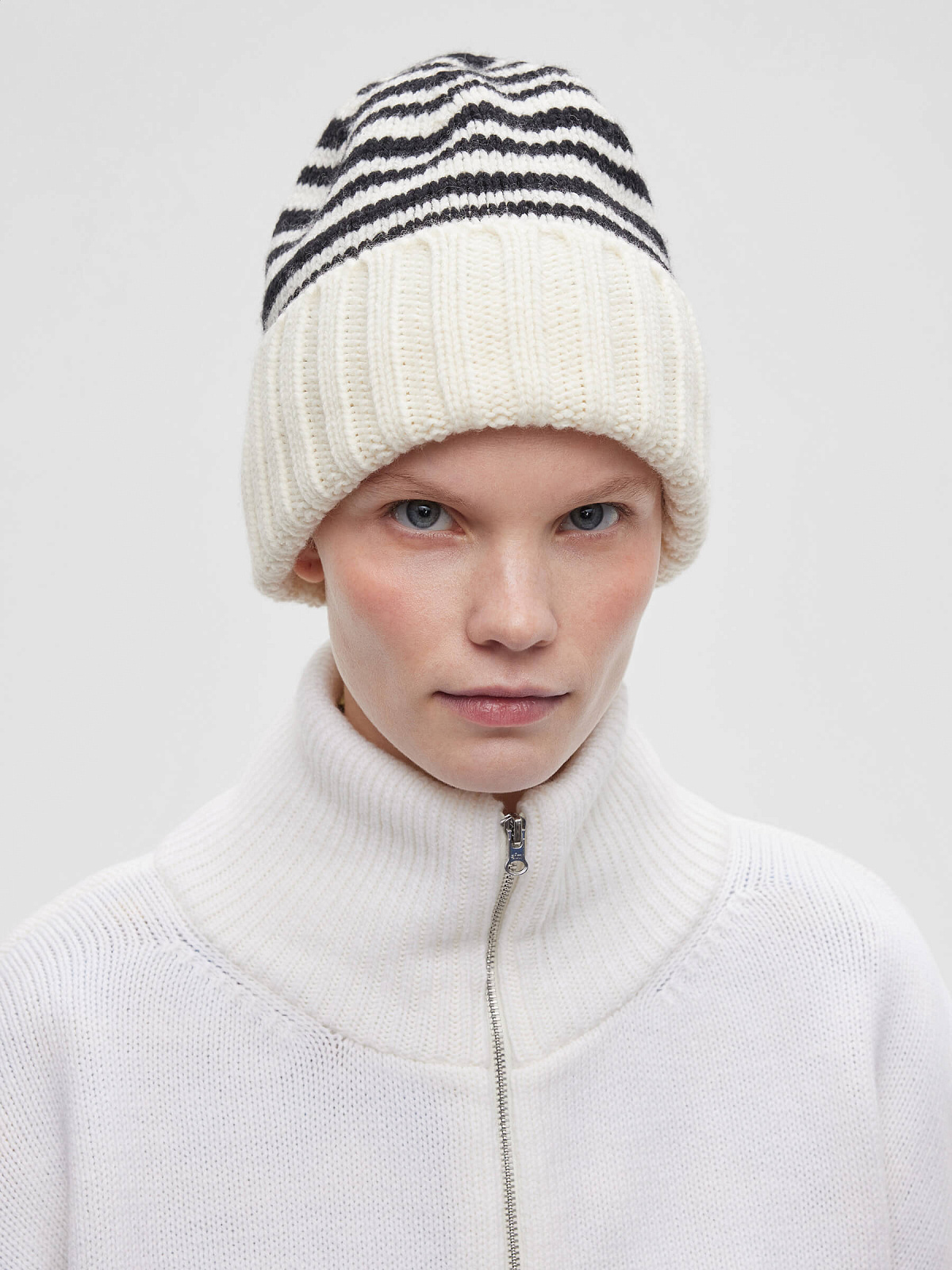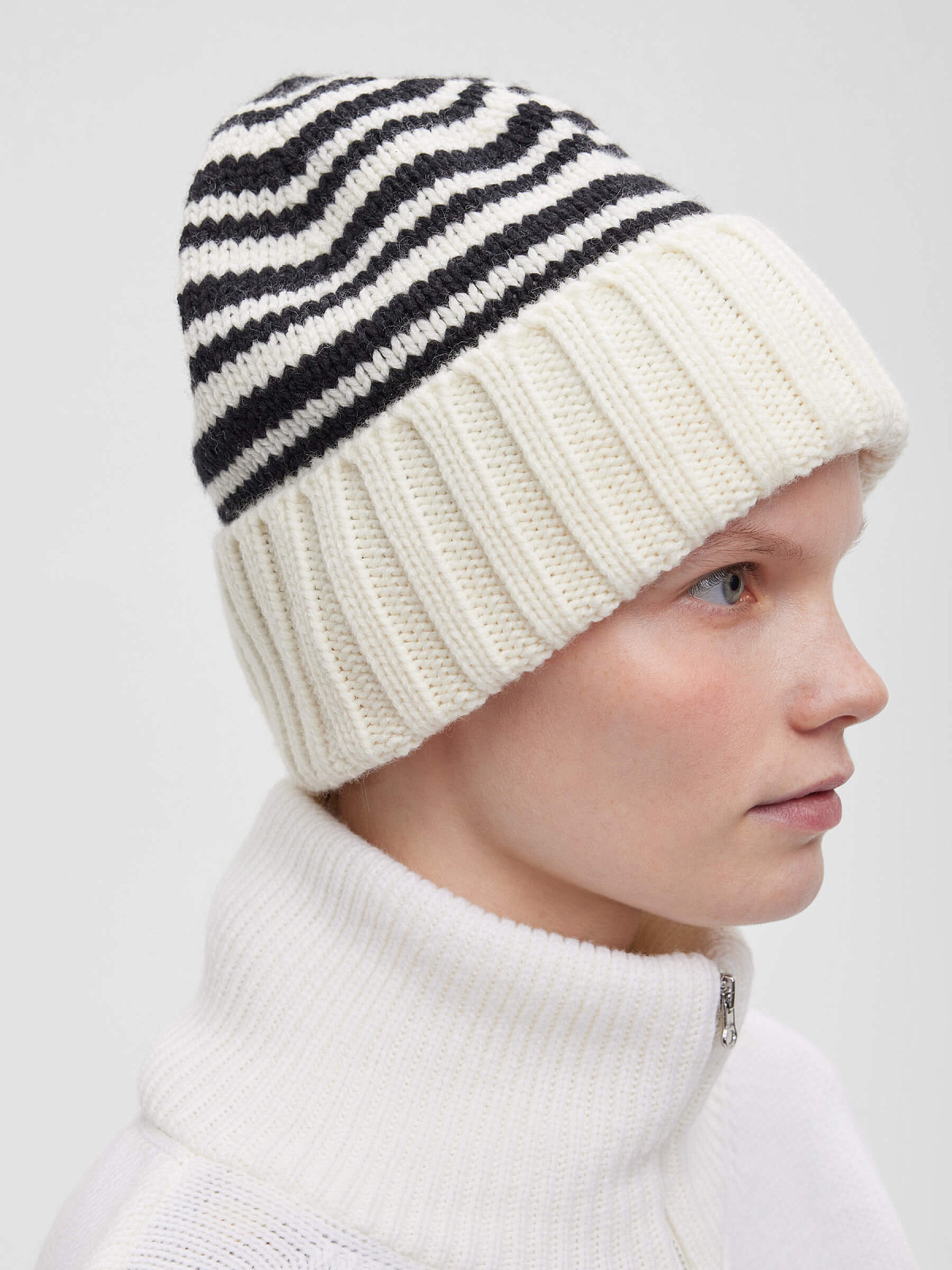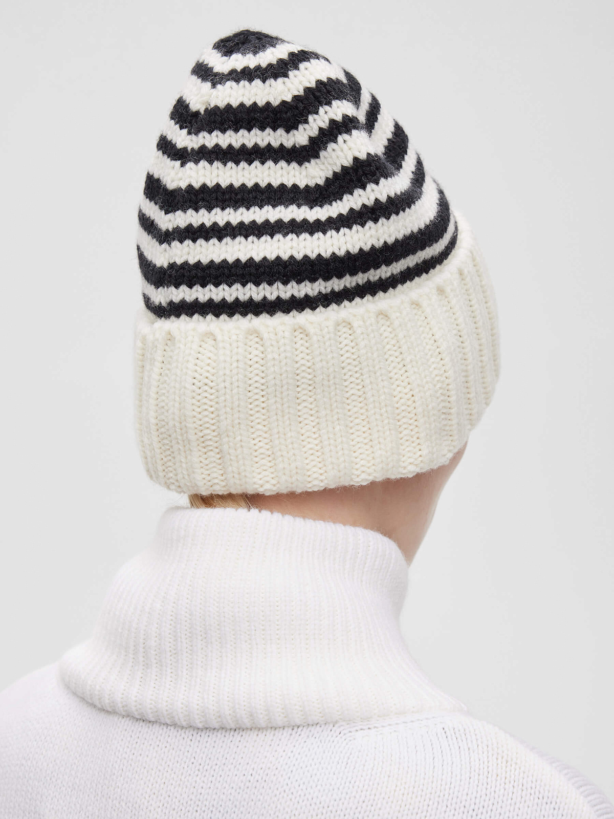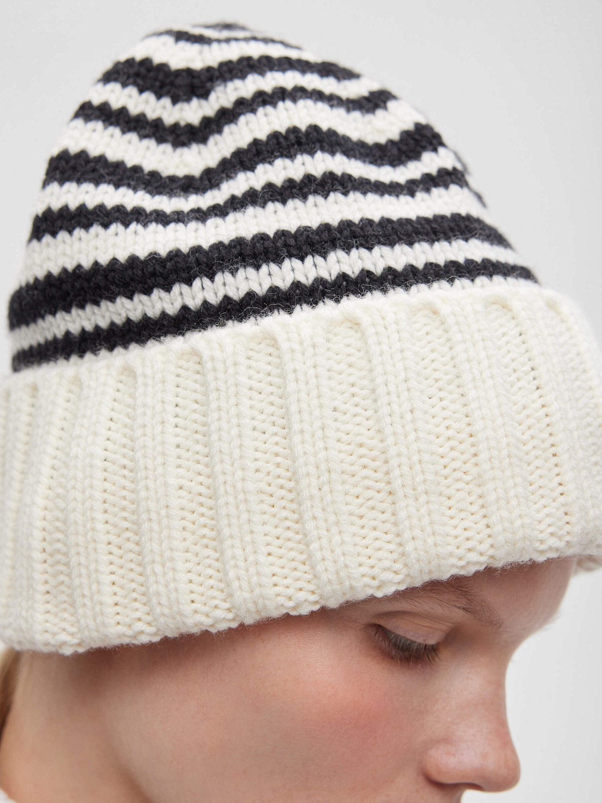 Шапка крупной вязки из шерсти мериноса в полоску с отворотом, связана в 5 нитей.