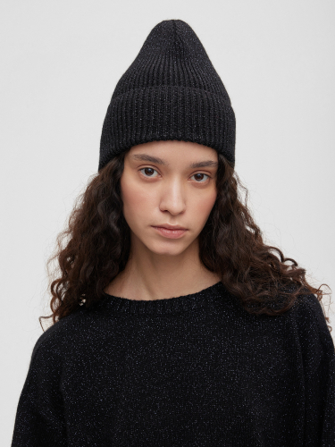 Шапка в рубчик с отворотом. Комбинация пуха ангорского кролика и тонкой шерсти в составе с добавлением люрекса создают текстуру с характерным ворсом.