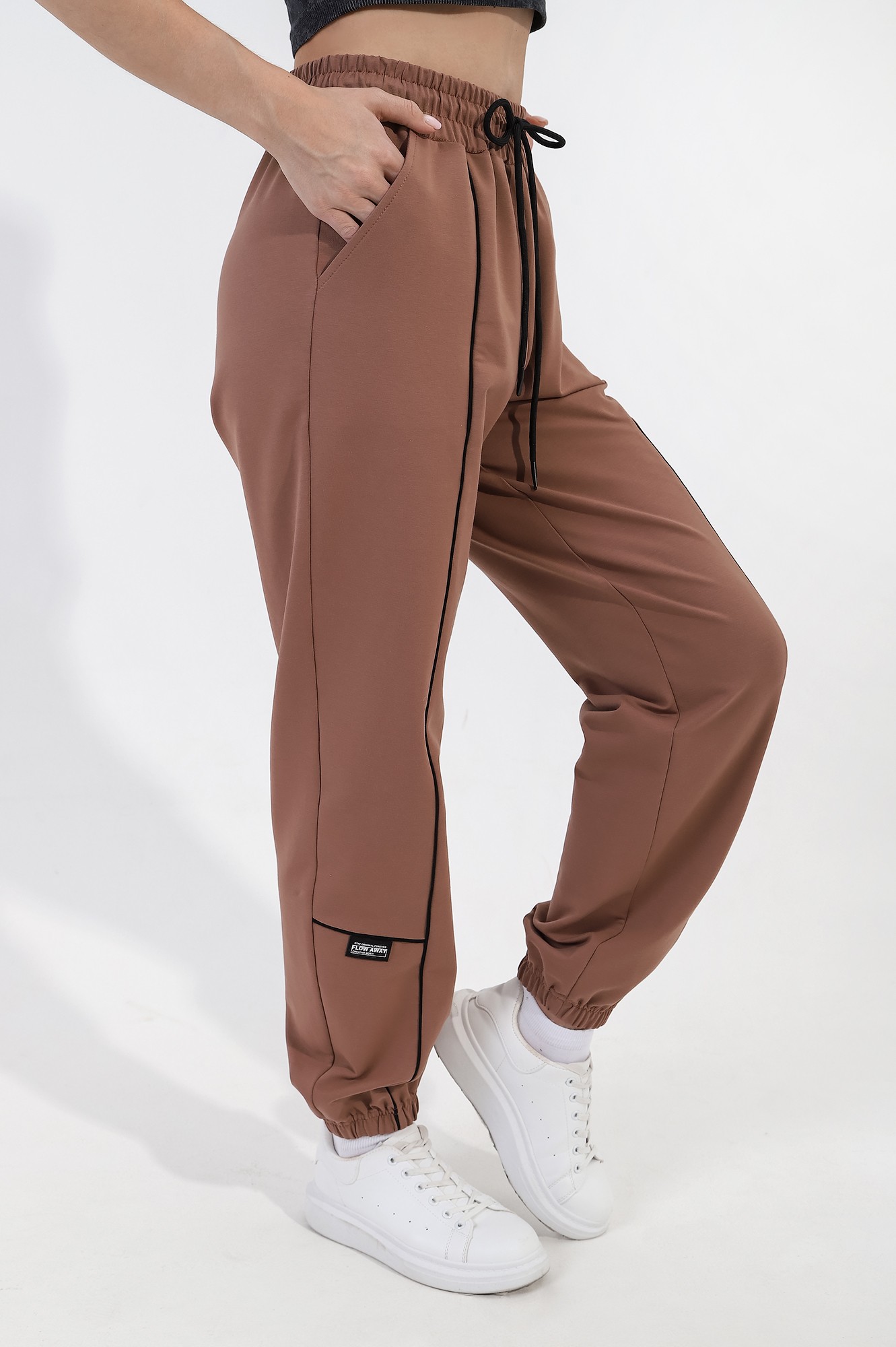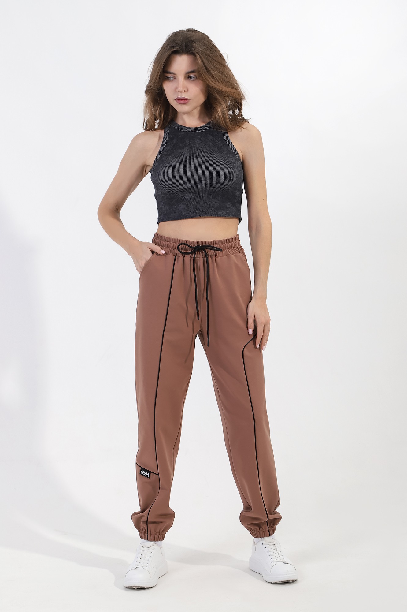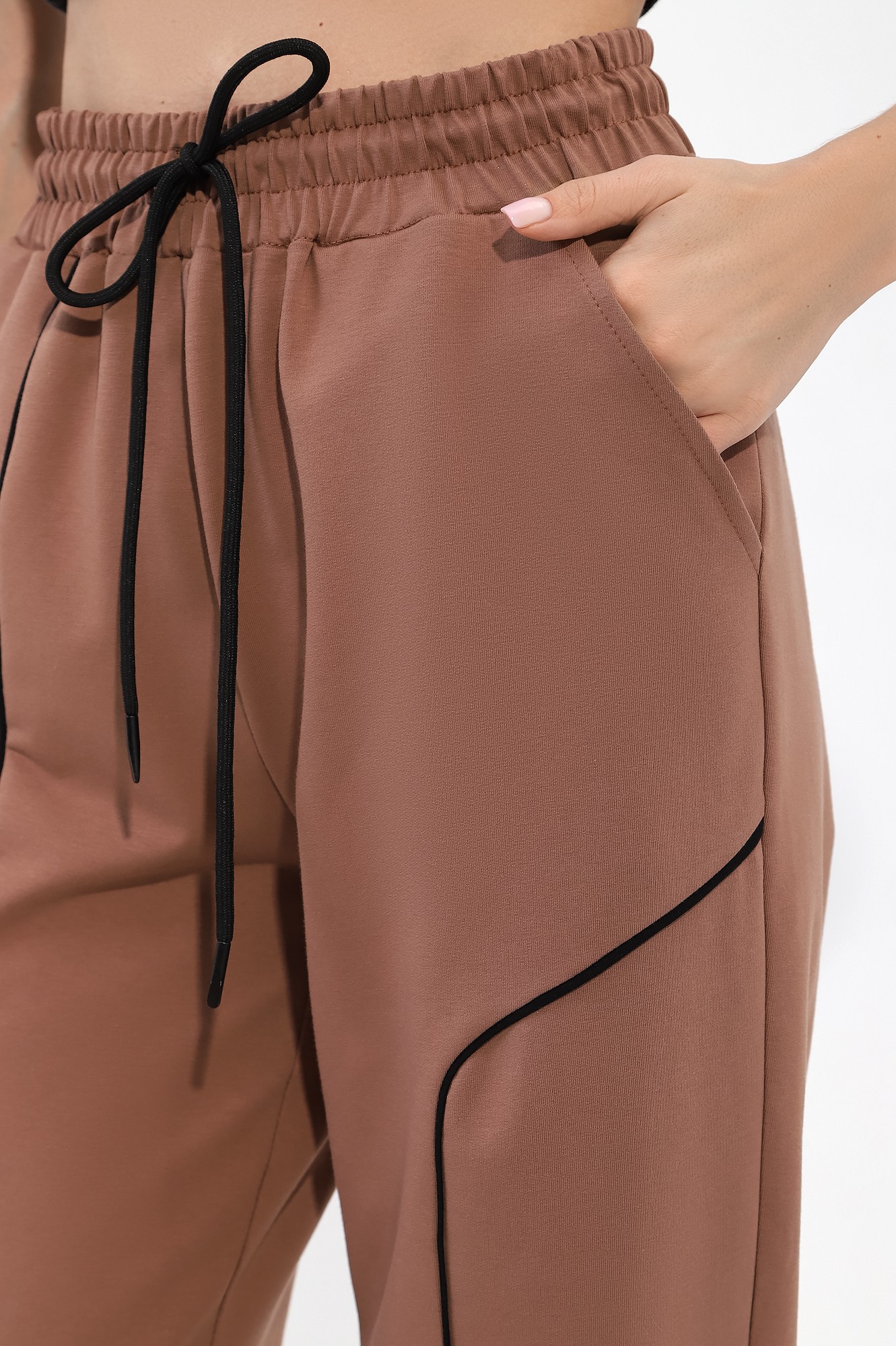 Брюки молодежные из трикотажного полотна «футер двунитка» с лайкрой, длинные, на притачном поясе с эластичной тесьмой внутри и шнурком, продетым через две петли в центре пояса, с карманами в боковых швах и эластичной тесьмой по низу. Правая половина брюк – из трех частей, левая - из двух частей фигурной формы, с кантом контрастного цвета в соединительных швах. На правой половине по горизонтальному шву настрочен декоративный элемент.