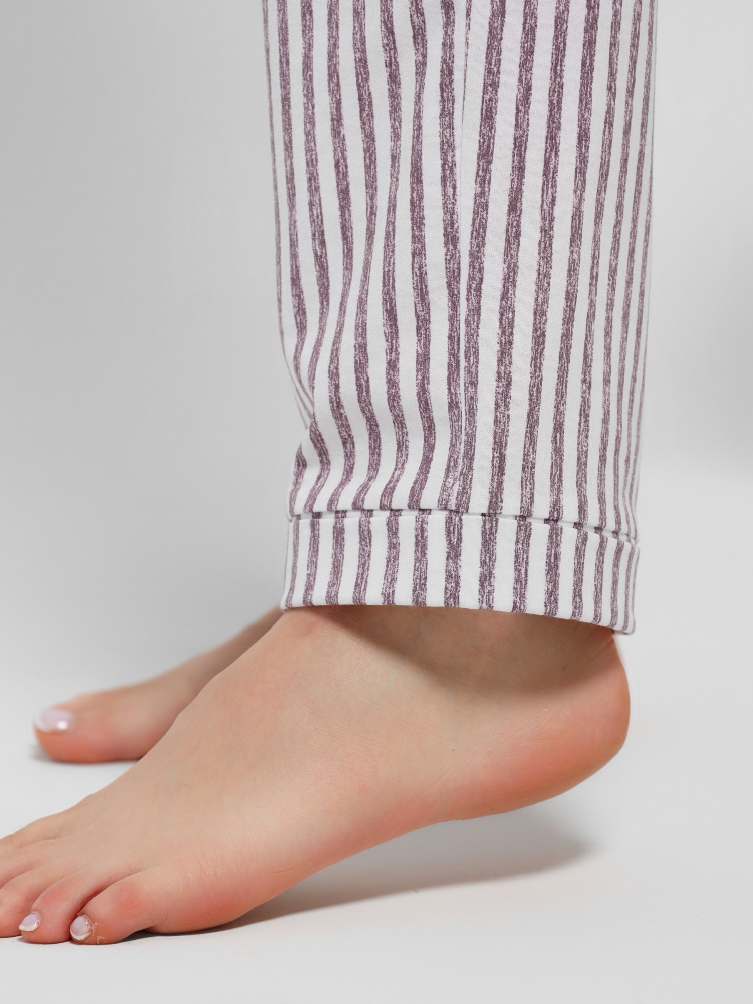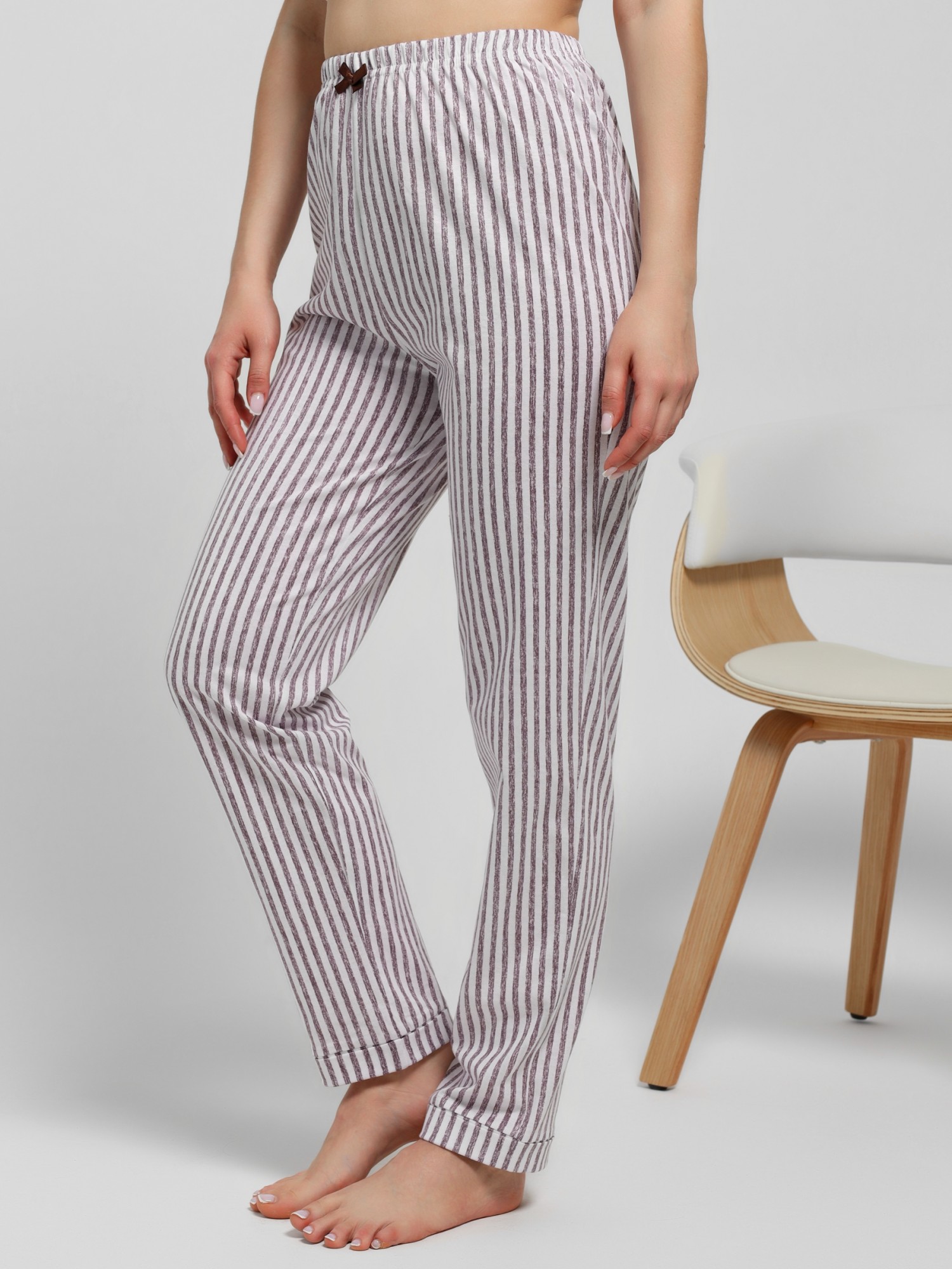 Брюки – из полотна с набивным рисунком в полоску, слегка зауженные книзу, с эластичной тесьмой по талии и притачными манжетами по низу. В центре переда по верхнему срезу прикреплен небольшой декоративный бантик из узкой атласной ленты.