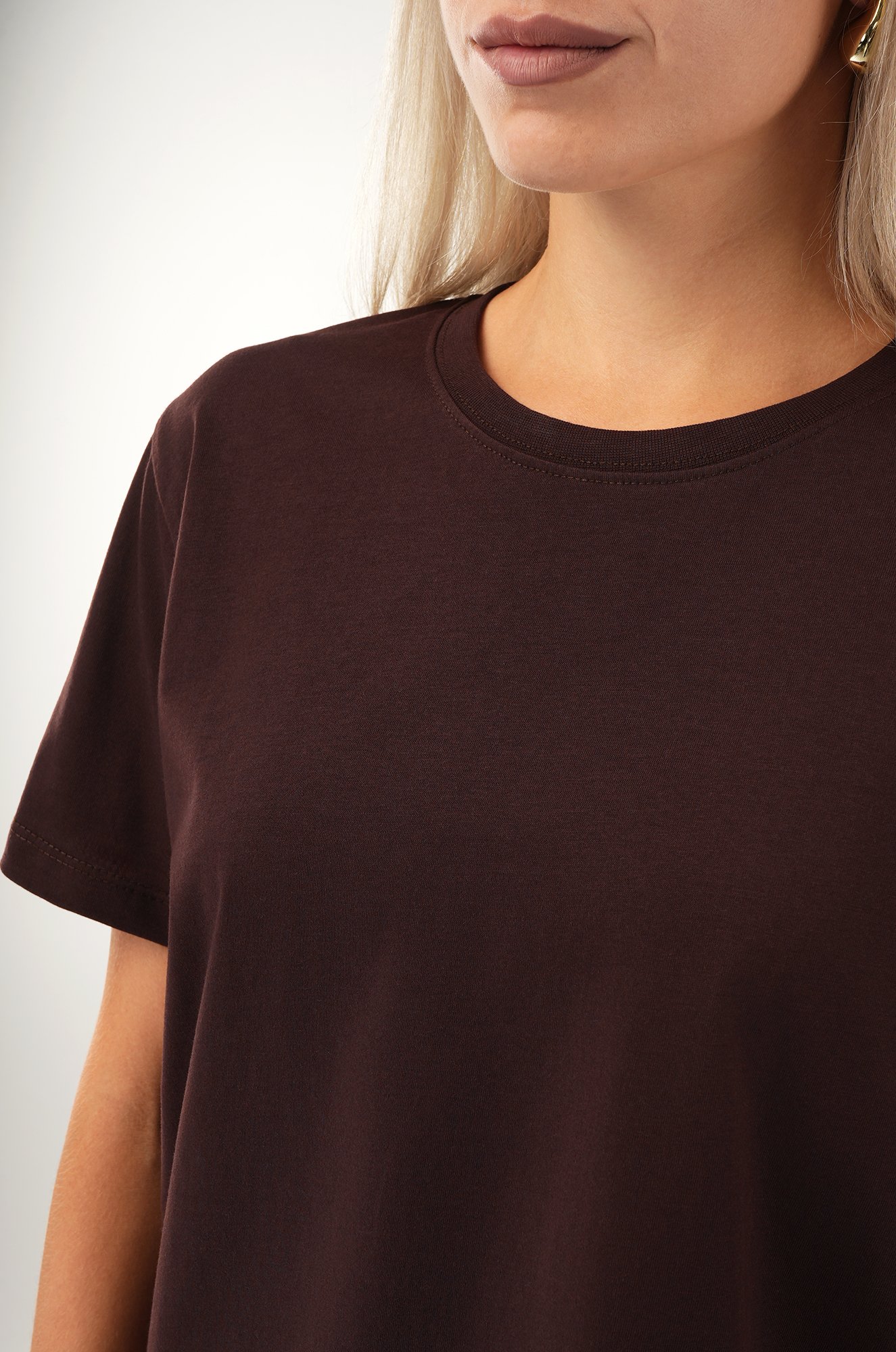 Трикотажная футболка шоколадного цвета станет стильной основой образов в стиле кэжуал.