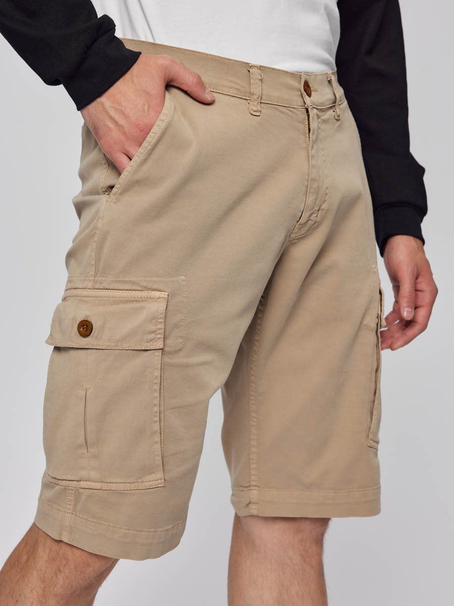 Мужские шорты-карго. Посадка Comfort fit (свободные по бедру), средняя посадка по талии спереди и высокая сзади, прямые к низу. Застежка на молнии. Шорты имеют боковые косые карманы, по бокам накладные карманы с клапаном застегивающиеся на  пуговицу, сзади имитация  прорезных карманов. Выполнены из слабоэластичной плотной ткани gabardine stretch. Крашение Garment dayed, т.е. покрашены в готовом виде после пошива. 98%Хлопок, 2%Эластан
