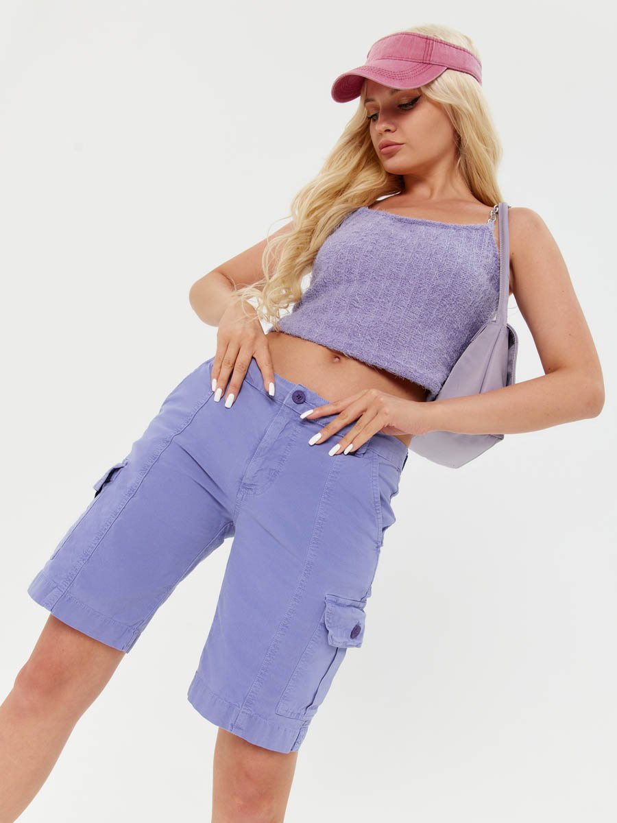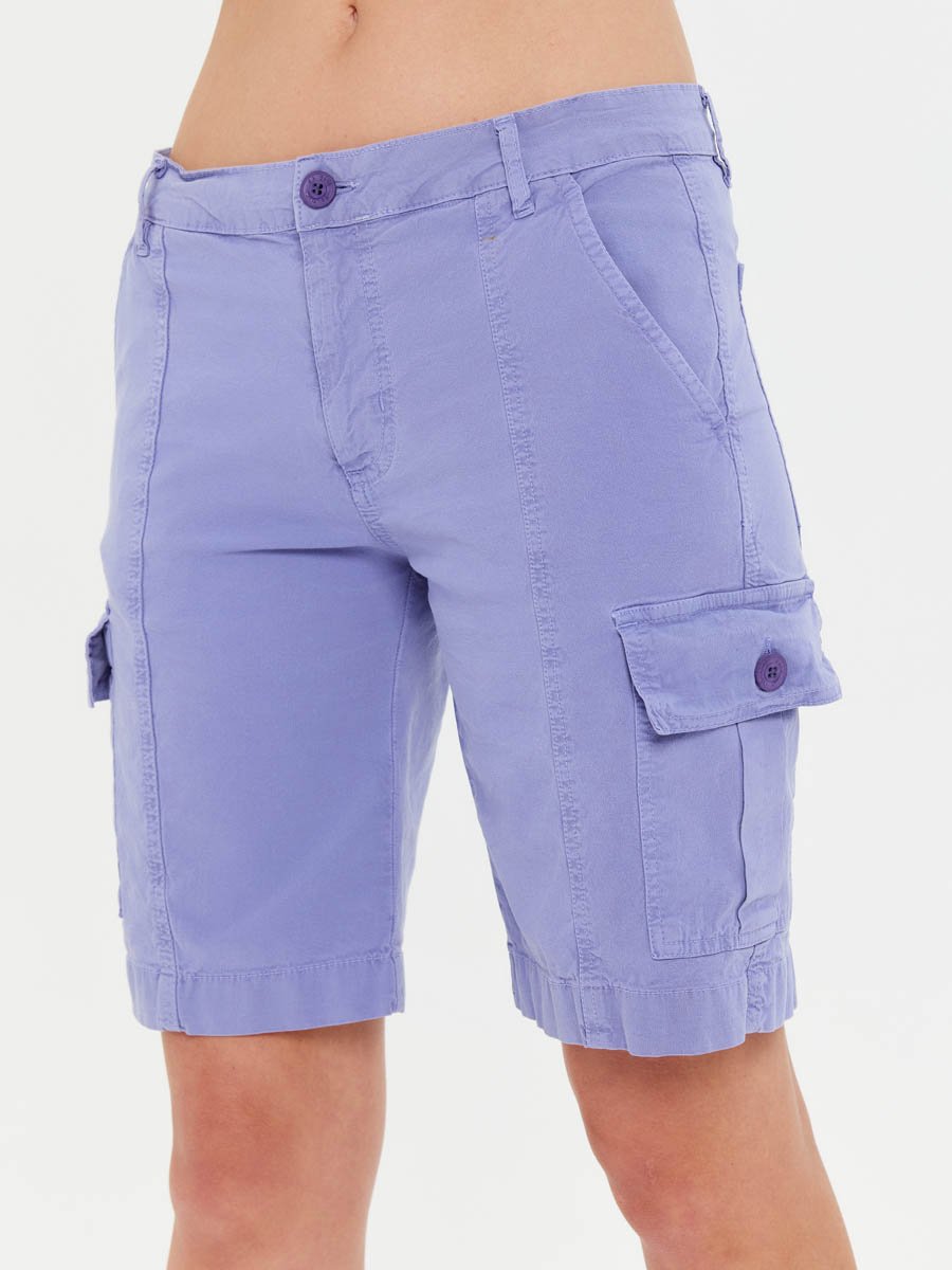 Женские удобные шорты-карго. Посадка Comfort fit (свободные по бедру), средняя посадка по талии, прямые к низу. Застежка на молнии. Шорты имеют центральный шов спереди, боковые косые карманы, по бокам накладные карманы с клапаном застегивающиеся на  пуговицу, сзади накладные карманы. Выполнены  из  слабоэластичной тонкой ткани poplin stretch. Крашение Garment dayed, т.е. покрашены в готовом виде после пошива. 98%Хлопок, 2%Эластан