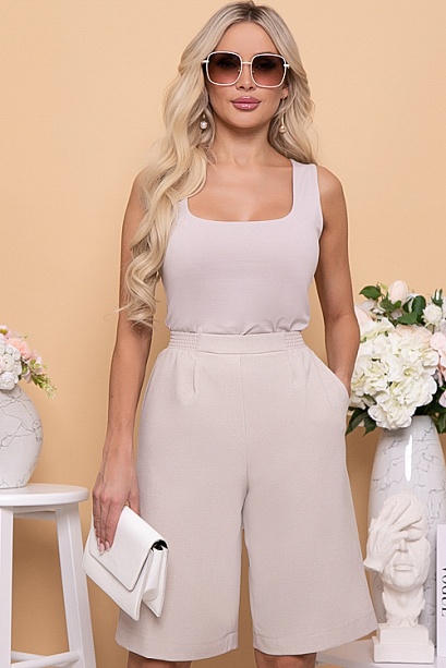 Шорты из легкой костюмной ткани без застежки,с имитацией гульфика по переду.По бокам функциональные карманы.Притачной пояс с эластичной резиной по бокам и спинке.