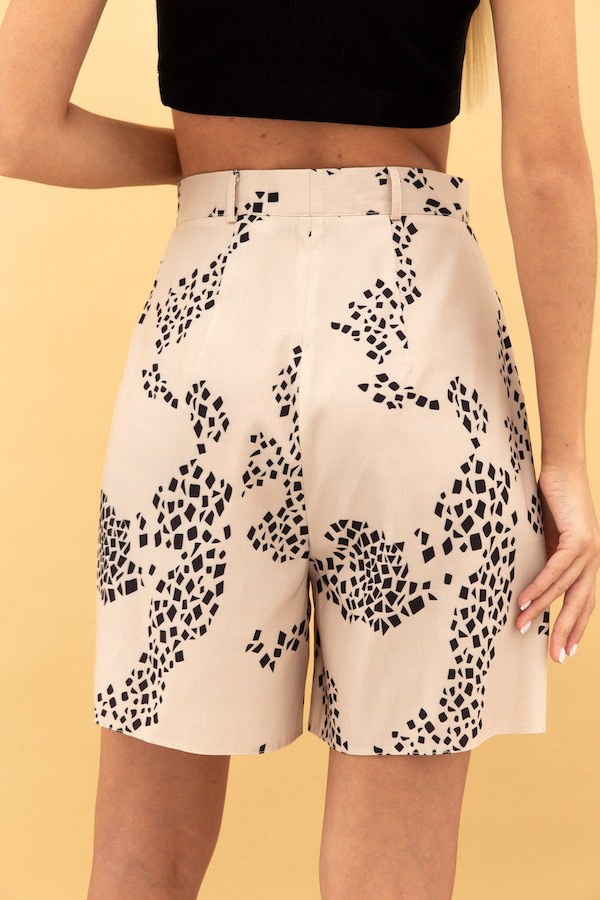 Шорты свободного силуэта из вискозной ткани. На передней половинке по линии талии застрочены складки. На задней половинке - талиевые вытачки. Карманы с подкройным бочком. Притачной пояс со шлёвками. Застёжка на молнию-гульфик и пуговицу.
