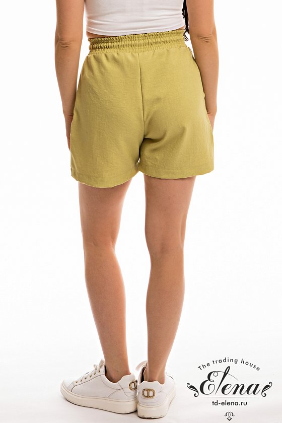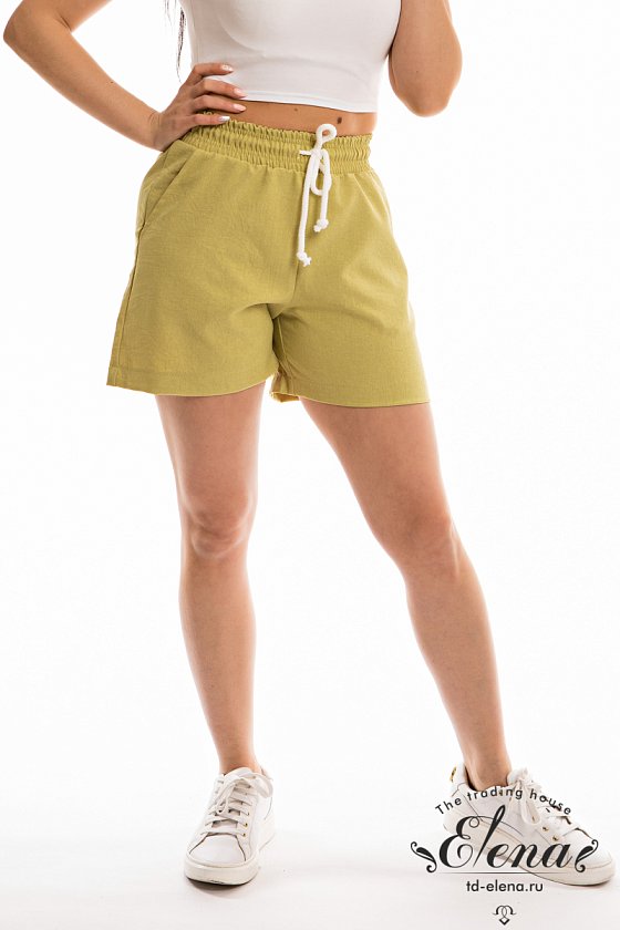 Шорты из однотонного искусственного льна, с боковыми карманами и притачным поясом на резине. Через петли пояса продёрнут шнур.