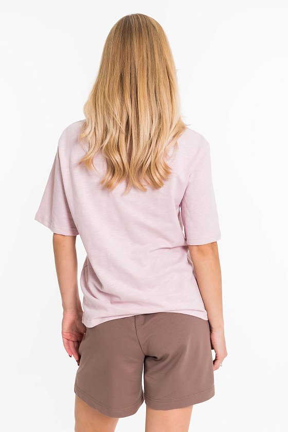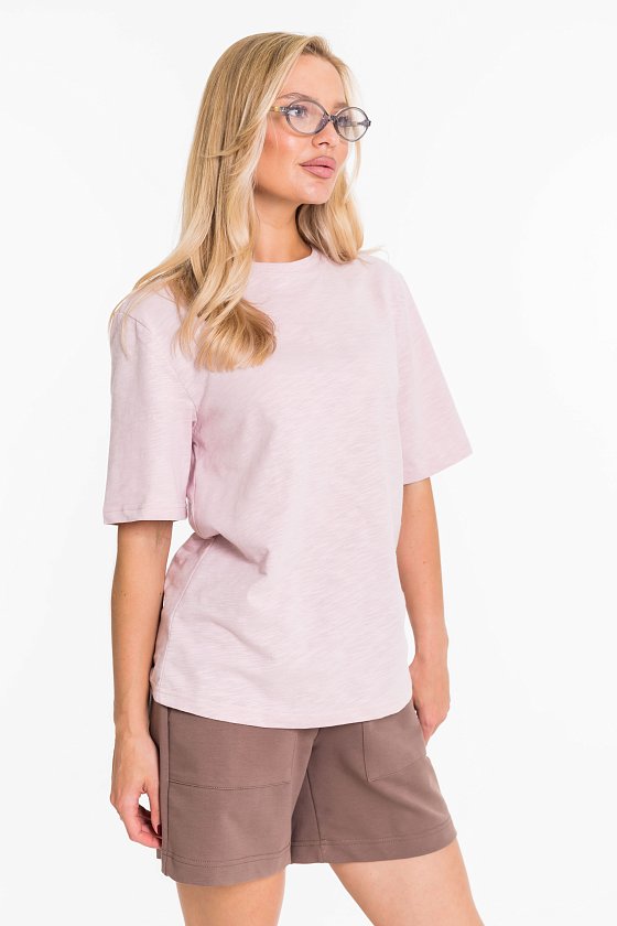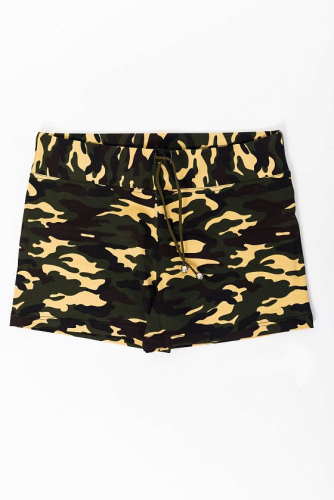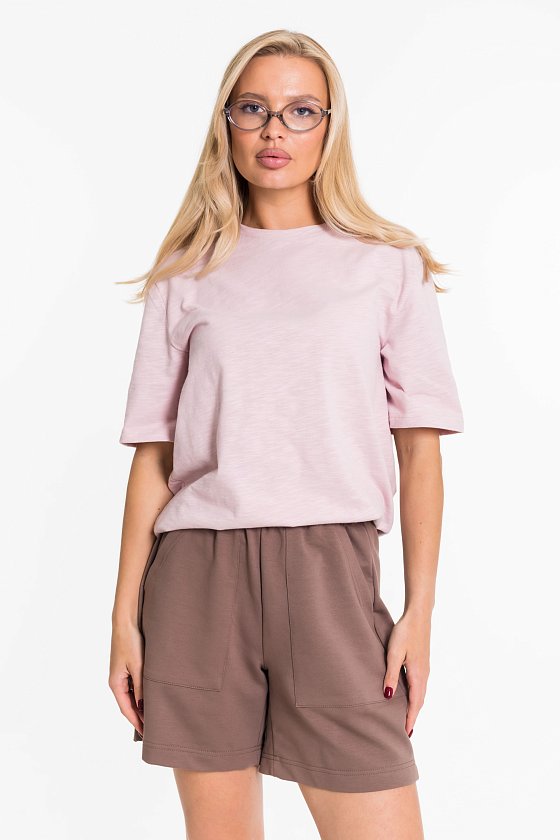 Женские шорты свободного кроя из футера двухнитки с накладными карманами и поясом на резинке.