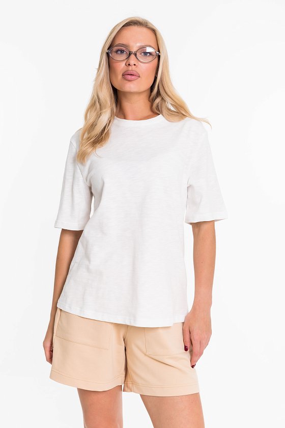 Женские шорты свободного кроя из футера двухнитки с накладными карманами и поясом на резинке.