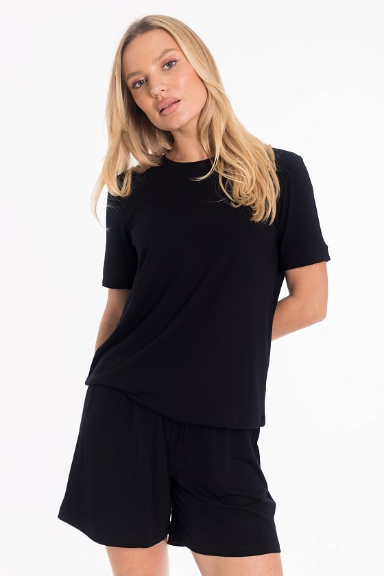 Женские шорты выполнены из чёрной вискозы - гладкого и приятного к телу материала, что обеспечивает комфорт в носке. Модель с поясом на резинке и декоративным шнуром смотрится лаконично и стильно. Шорты без карманов, легко сочетаются с другими элементами гардероба.