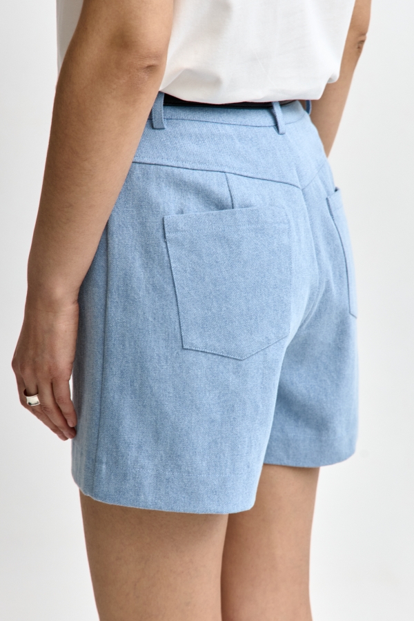 Базовые шорты из джинсового полотна. Модель прямого силуэта на притачном поясе. По спинке кокетка, накладные карманы. По переду боковые карманы, застёжка-гульфик.