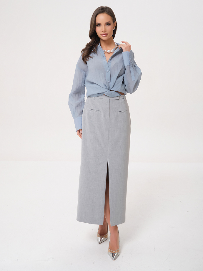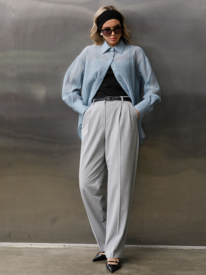 Модель прямого силуэта, со спущенным плечом. Спереди застёжка на петли и пуговицы. Спинка с кокеткой, под кокеткой сборка. Воротник сорочечный. По низу рукава защип, планка и закруглённая манжета с застёжкой на пуговицы. Низ блузки закруглён.