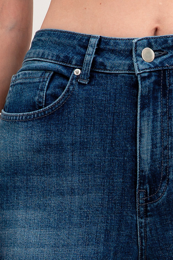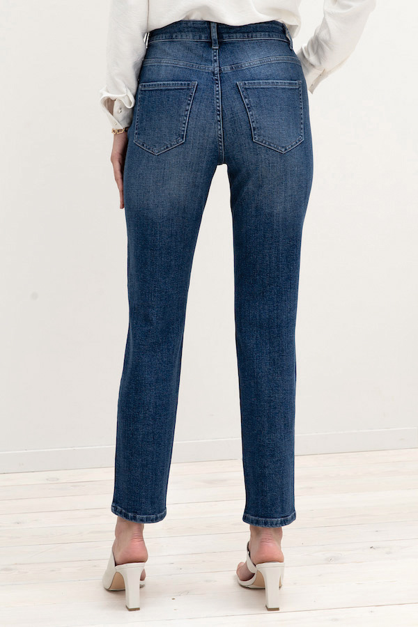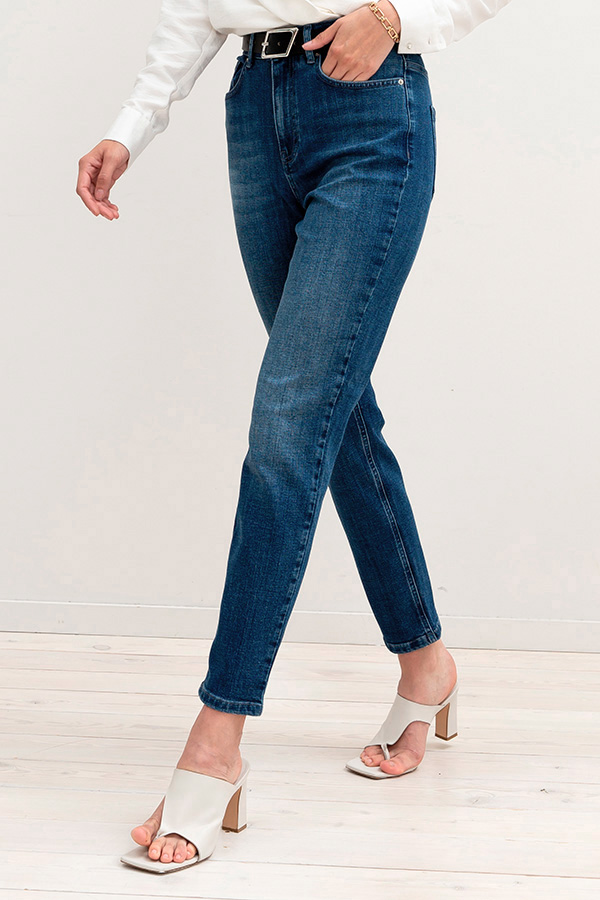 Брюки из эластичного денима, зауженные книзу выполнены по классической джинсовой технологии (варка с эффектом легкого выбеливания). На задней части брюк выполнены накладные карманы, на передней - карманы с подкройным бочком. Притачной пояс со шлёвками. Застёжка на молнию-гульфик и пуговицу.