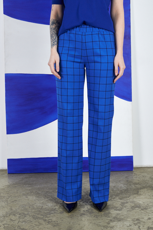 Брюки прямого силуэта из костюмной ткани. Пояс притачной с эластичной резиной.