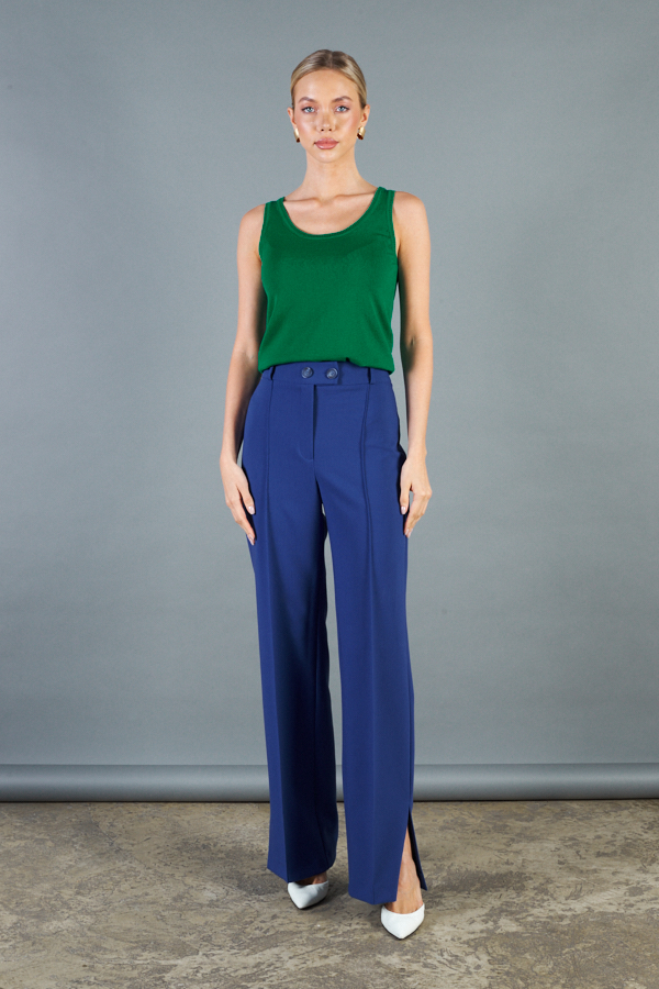 Брюки прямого силуэта, с разрезами в боковых швах из костюмной ткани. На передней части брюк застрочены стрелки. Притачной пояс со шлёвками. Застёжка на молнию-гульфик и пуговицу. Секрет такой модели кроется в безупречно точной посадке по талии и бедрам – ничего лишнего, только конструктивные детали, которые придают четкость линиям силуэта.