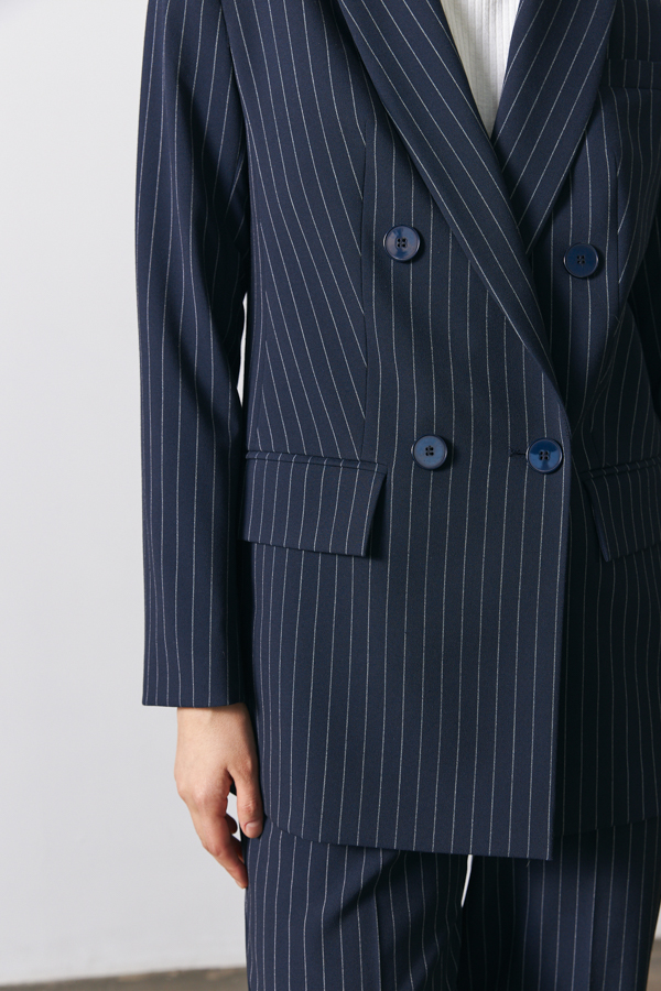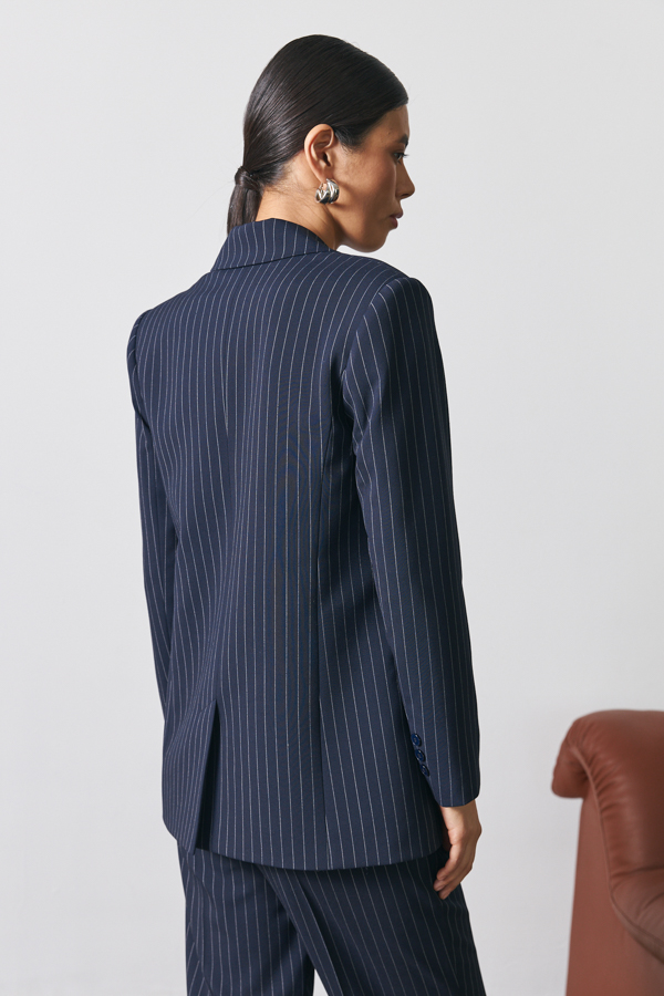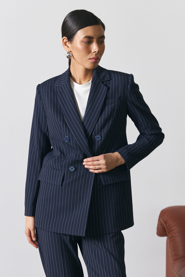 Двубортный жакет из костюмной ткани. Изделие полуприлегающего силуэта с английским воротником и застежкой на пуговицы. На передней части жакета выполнен нагрудный карман с листочкой и карманы в рамку с клапаном. По центру задней части выполнена шлица - элемент декоративный и необходимый. Обеспечивает свободу движения, добавляет шику и элегантности. Втачной длинный рукав, снизу имитация шлицы с пуговицами. Изделие идеально держит форму, имеет четкую линию плеча благодаря плечевым накладкам. Жакет на подкладке.